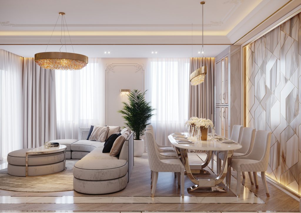 De fapt, în cazul acesta vorbim despre o amenajare neoclasică. Iar printre elementele iconice ale acestui stil putem enumera și masa și scaunele. Atmosfera este susținută și de ancadramentele de pe pereți și tavan, dar și de peretele accent, pe care putem observa cu ușurință un joc geometric de linii aurii, ce dau o notă de lux.