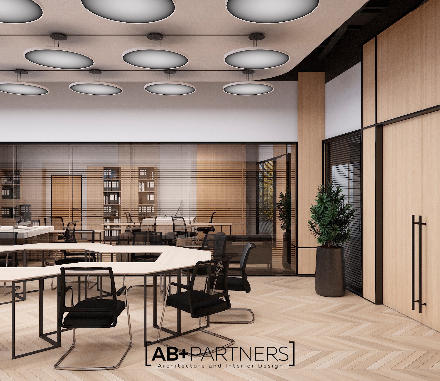 We dissolved the strictness of the office atmosphere with the help of the warm structure of wood, the material that we have used in abundance in the project. Due to the interior walls made of glass and also quite large windows, the atmosphere is full of air and light, providing the necessary dose of comfort throughout the entire working day.