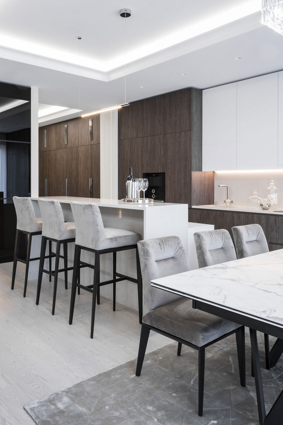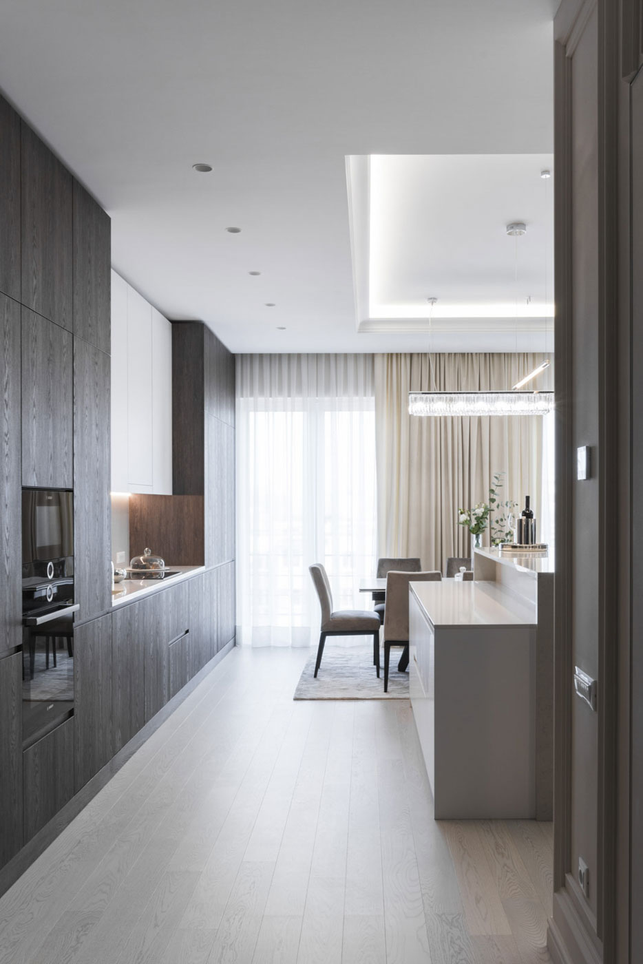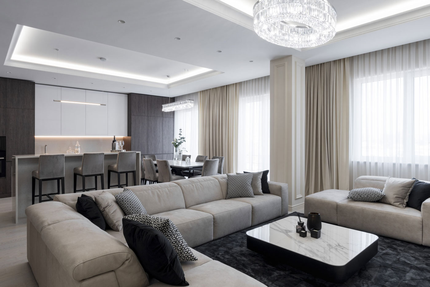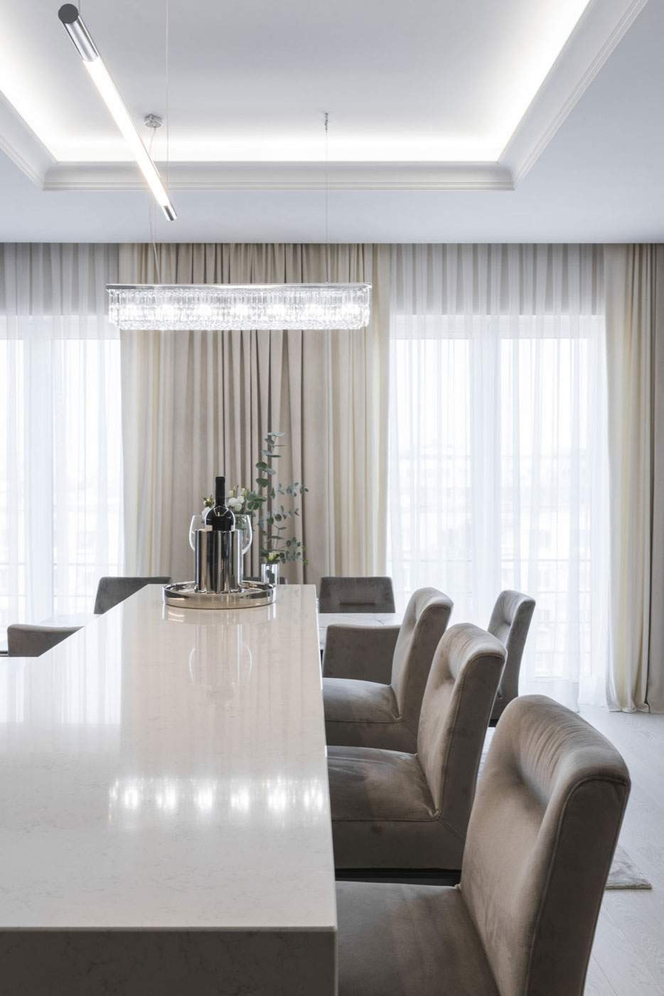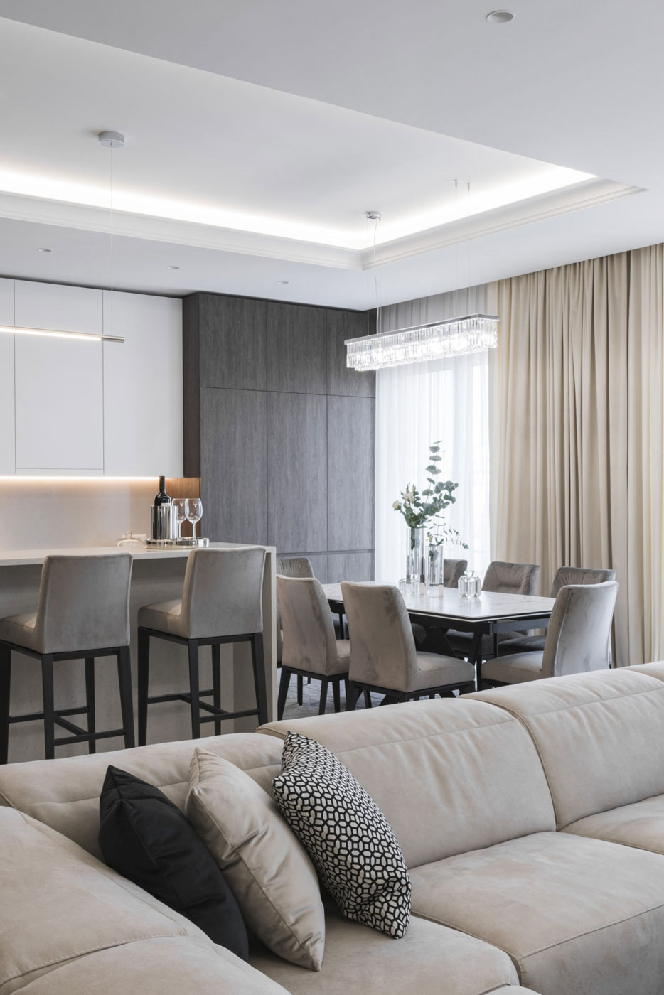 The feeling of space and elegance are the main stakes of this project. That is why we have created a spacious living area, which occupies half of the total area of the dwelling. The open space was thought of as a comfortable space in which the kitchen, living room and the dining room were combined. The range of calm colours that dominates the entire dwelling creates the atmosphere of comfort and warmth. We have obtained elegance of the space using symmetry, precious materials, classical framing and luminaires, which have become the subtle accents of the room.