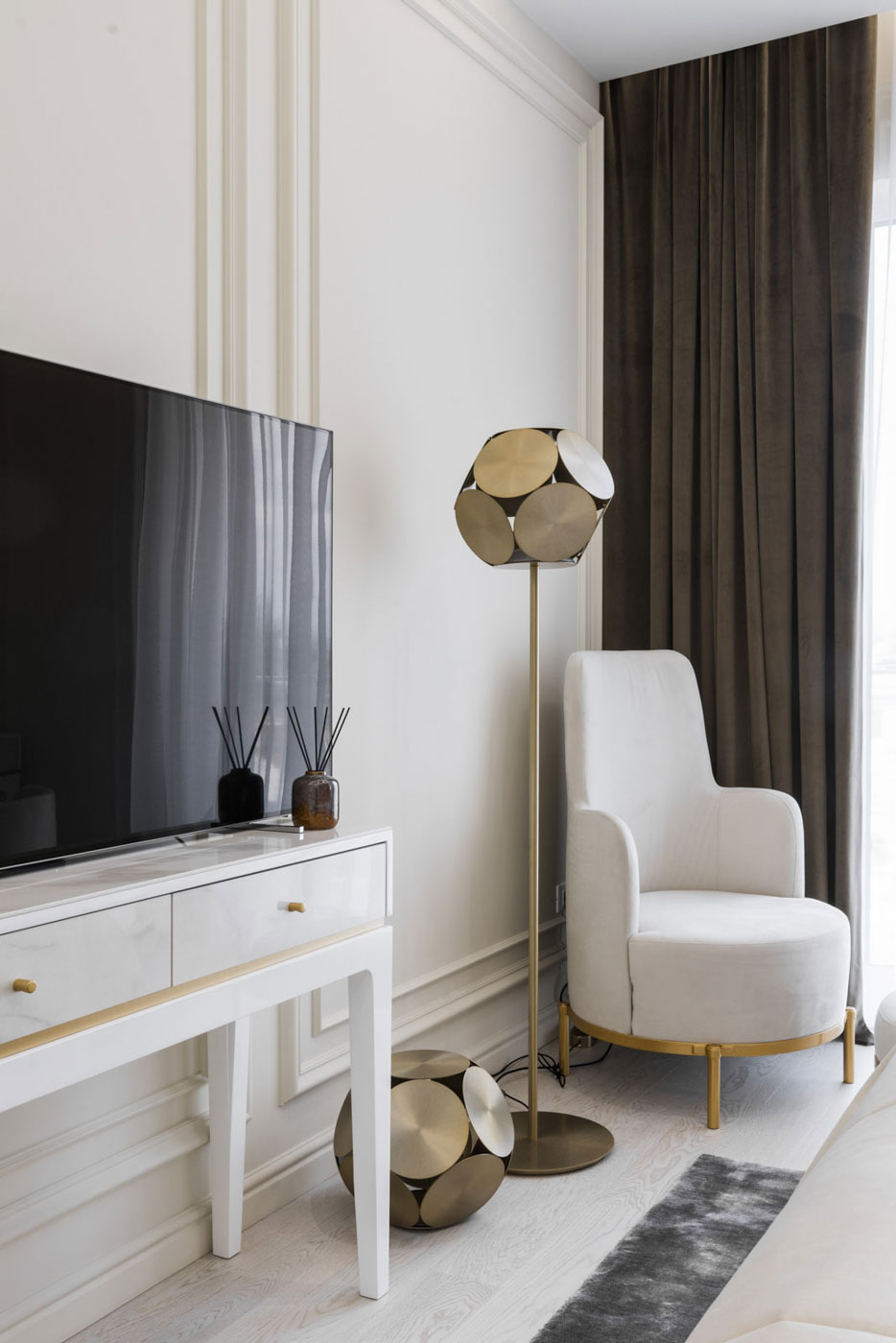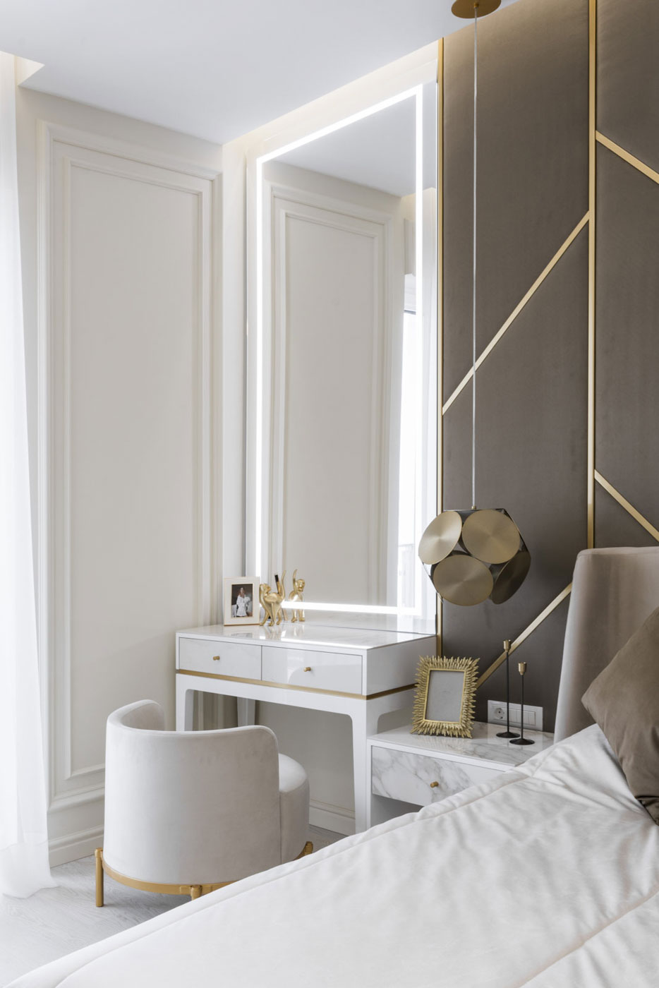 Spacious and bright, so looks this project of a 120 sq.m. penthouse. Designed for a young couple, the interior borrows from their appetite for life. Modern ideas of the customers take the lead of the entire project, so very simple and straight lines meet the neoclassical details in this project.