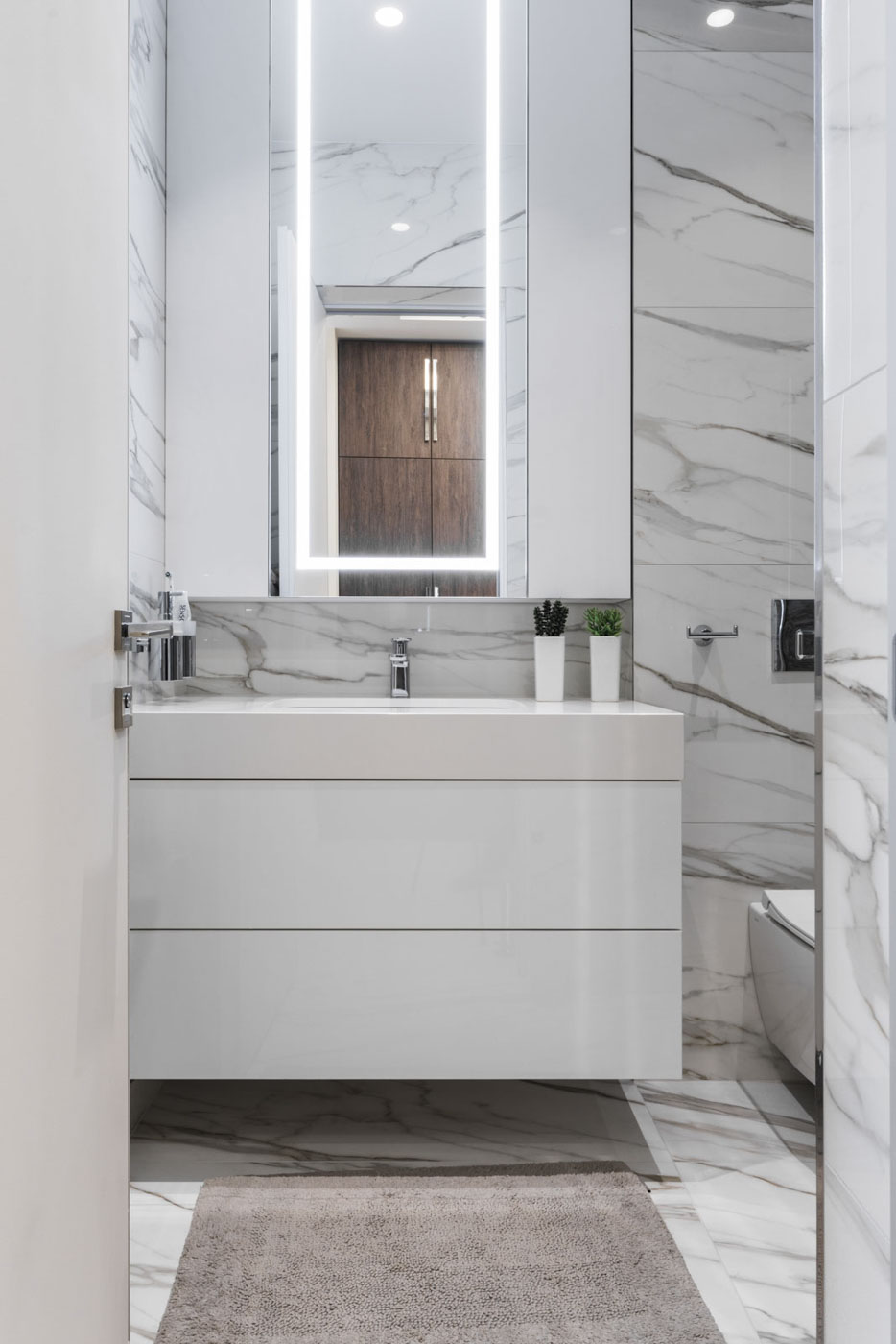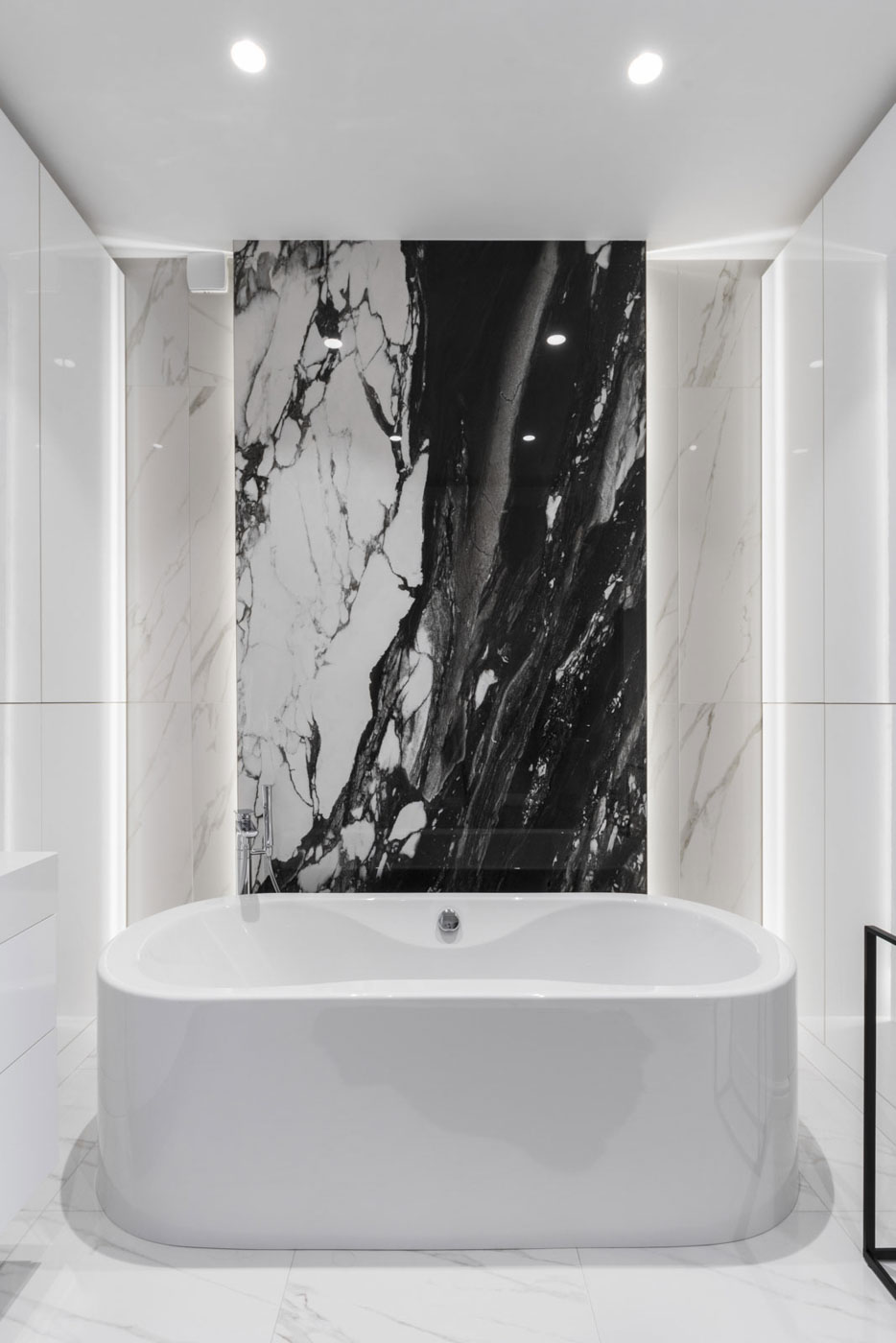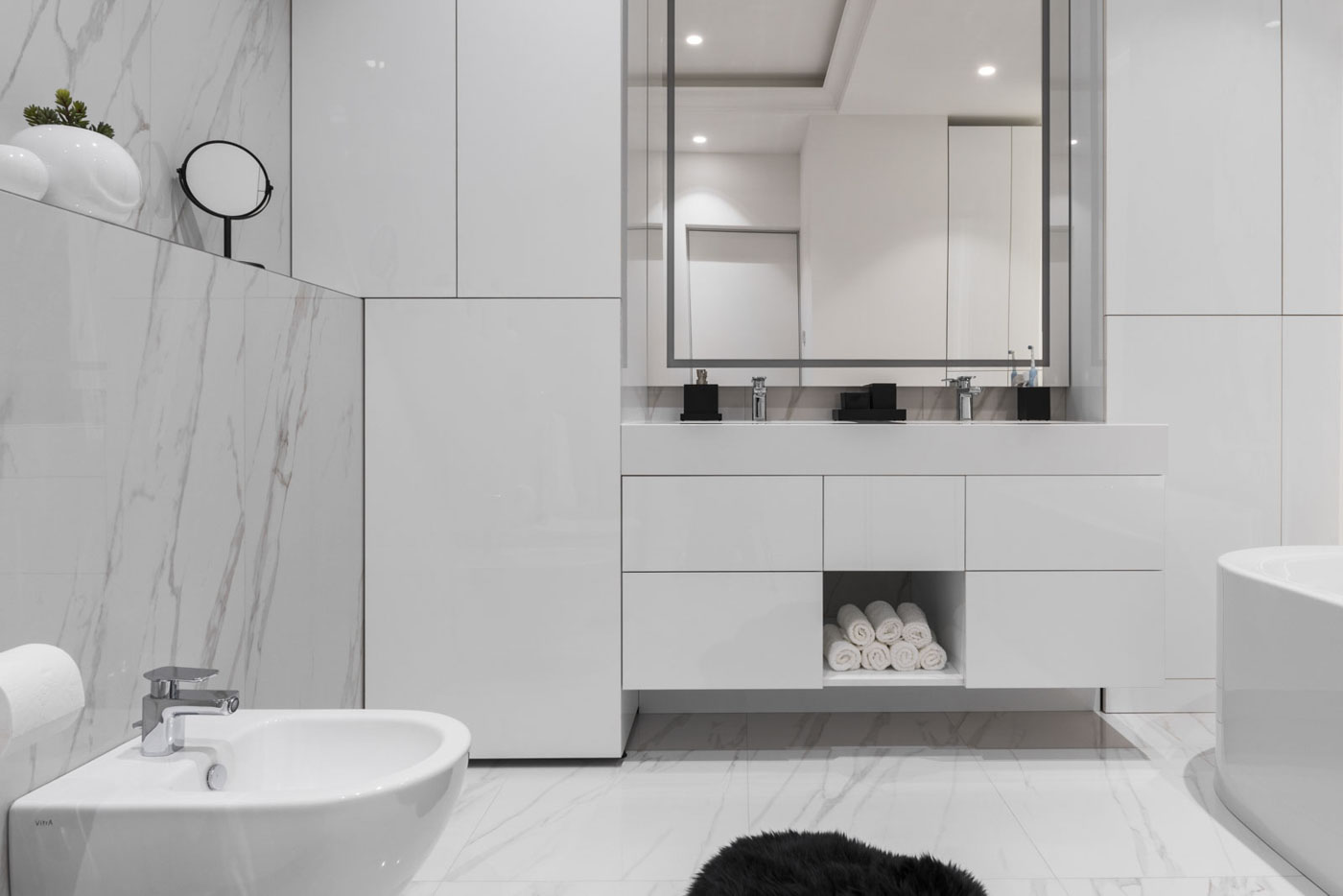 The hidden frame of the door coplanar to the wall ensures the absence of unnecessary details. Also, there have been done significant changes in partitioning, using which we have slightly moved the walls of the bathrooms to favour them.