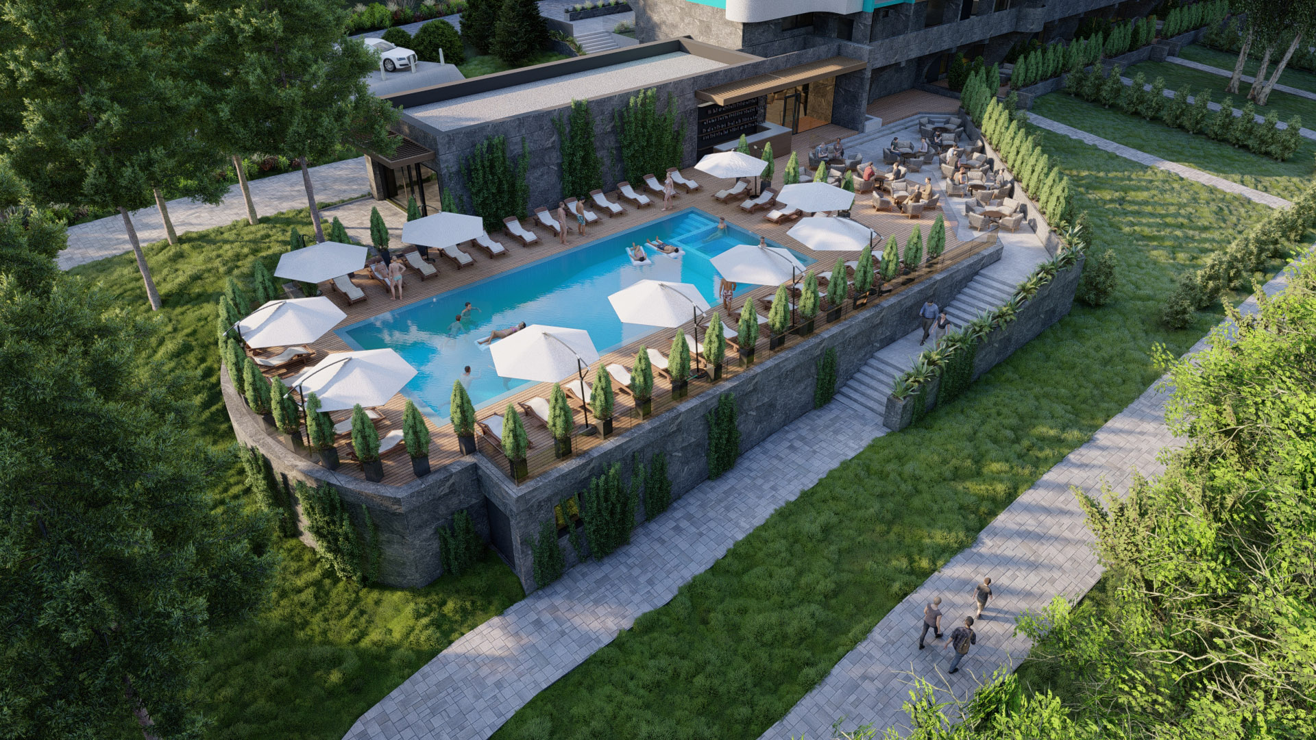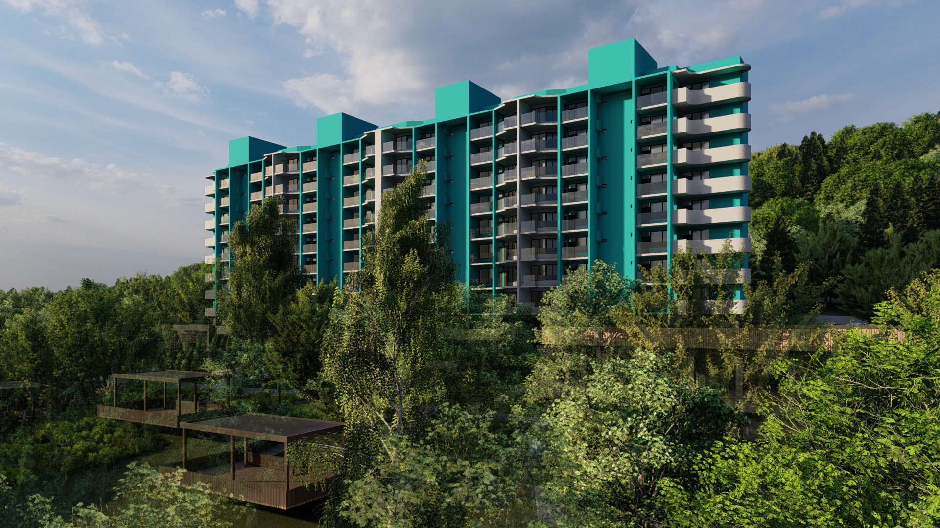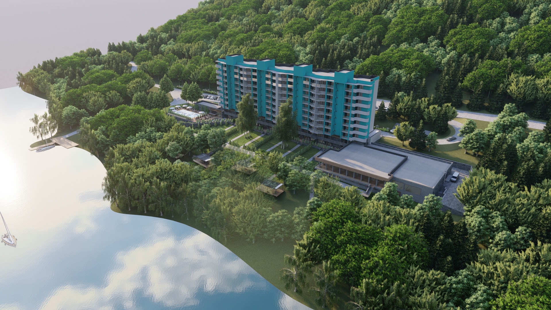 The former hotel rooms have been reconfigured into 78 apartments, whose interior design projects have already been created, being equipped with all the utilities to guarantee the comfort for the dwellers. Being located in an area with spectacular views, the residential complex has given us the opportunity to create a fusion with nature and stunning views while arranging the courtyard, parking, outdoor pool, playground, sports area, restaurant with the terrace, hall for banquets, bungalows and pontoons.