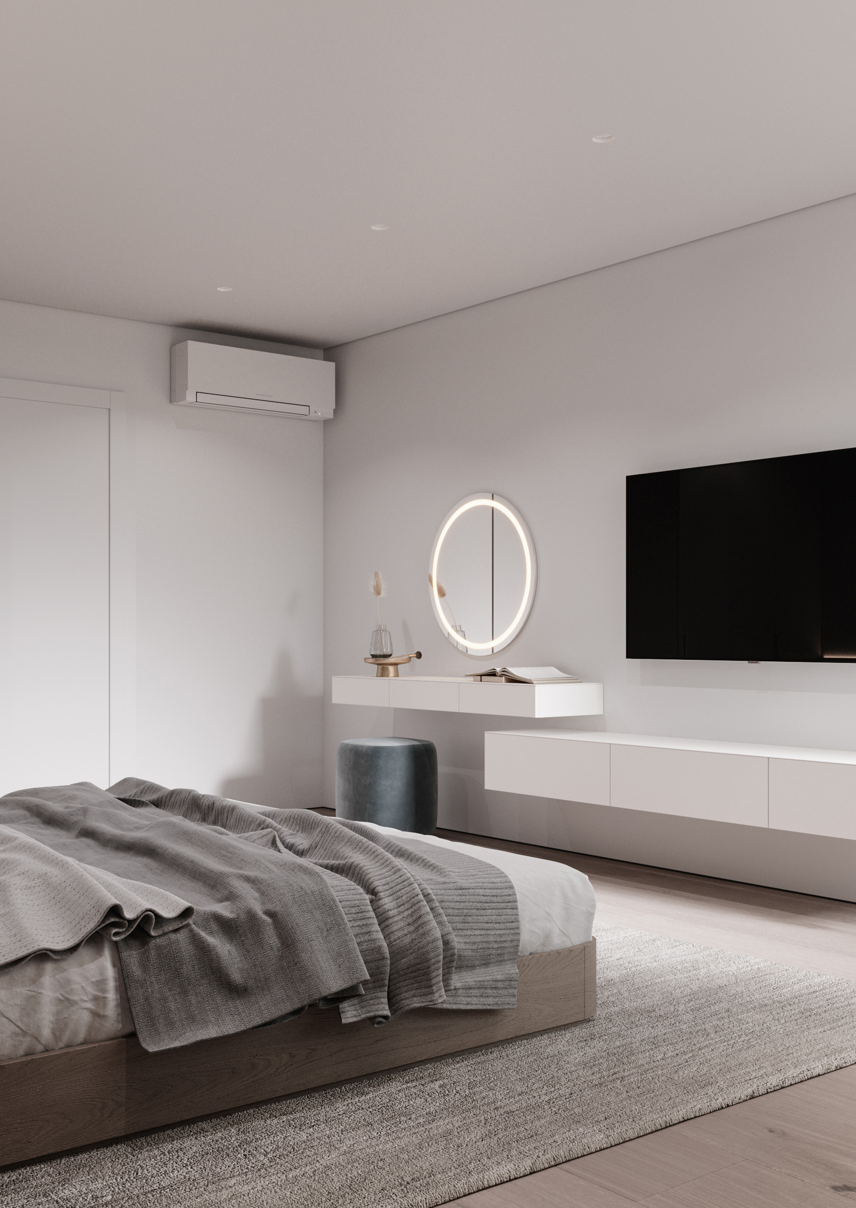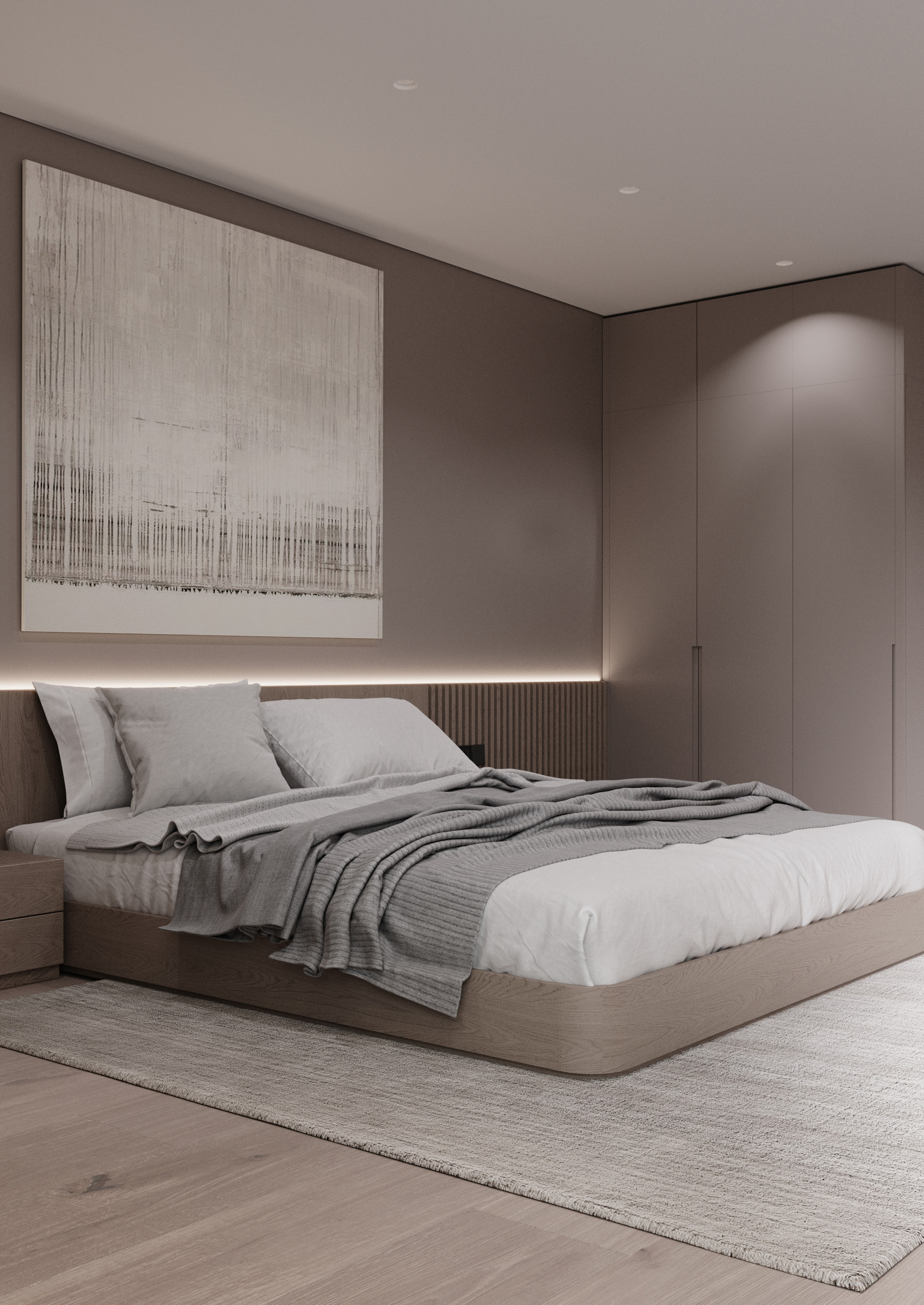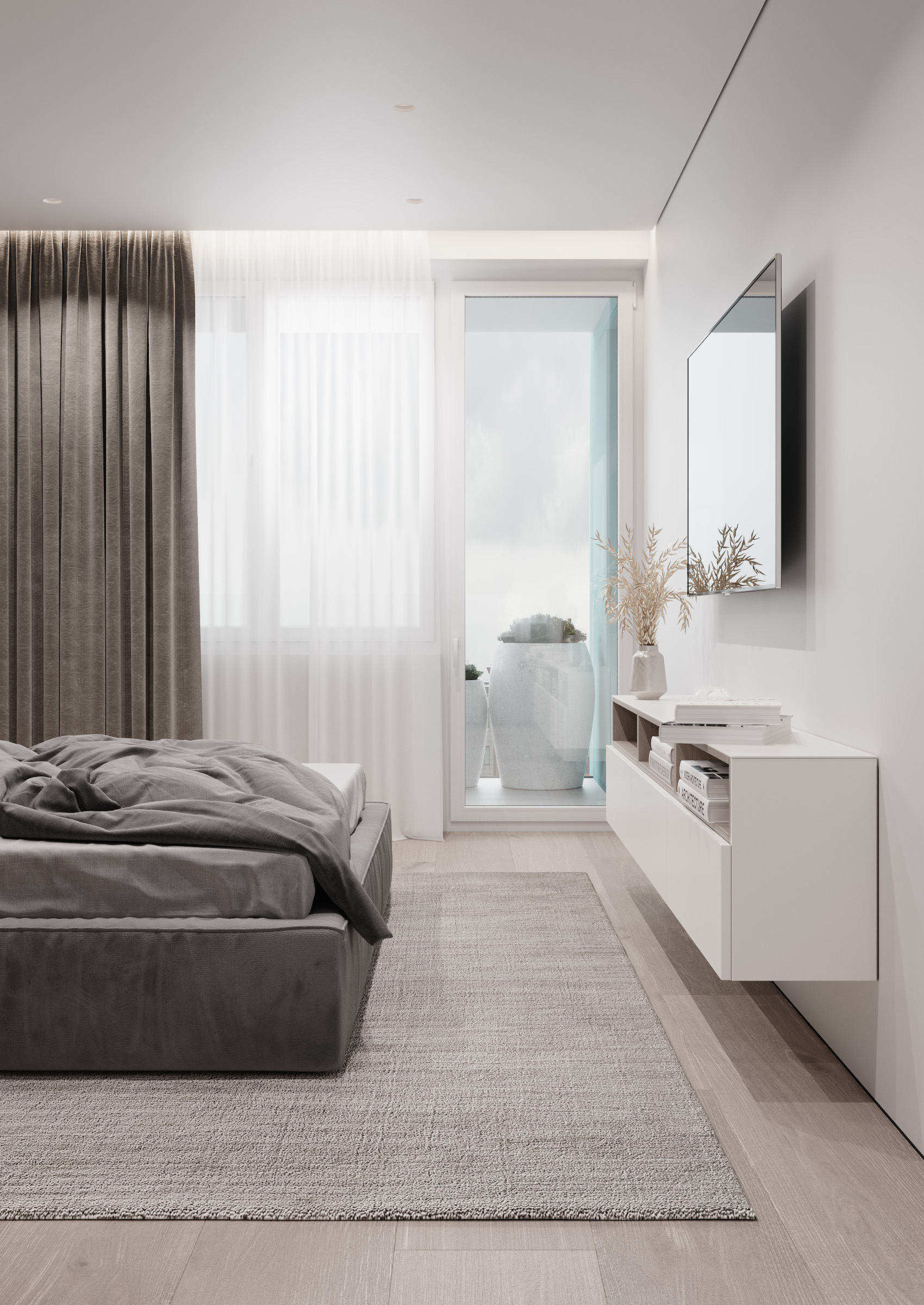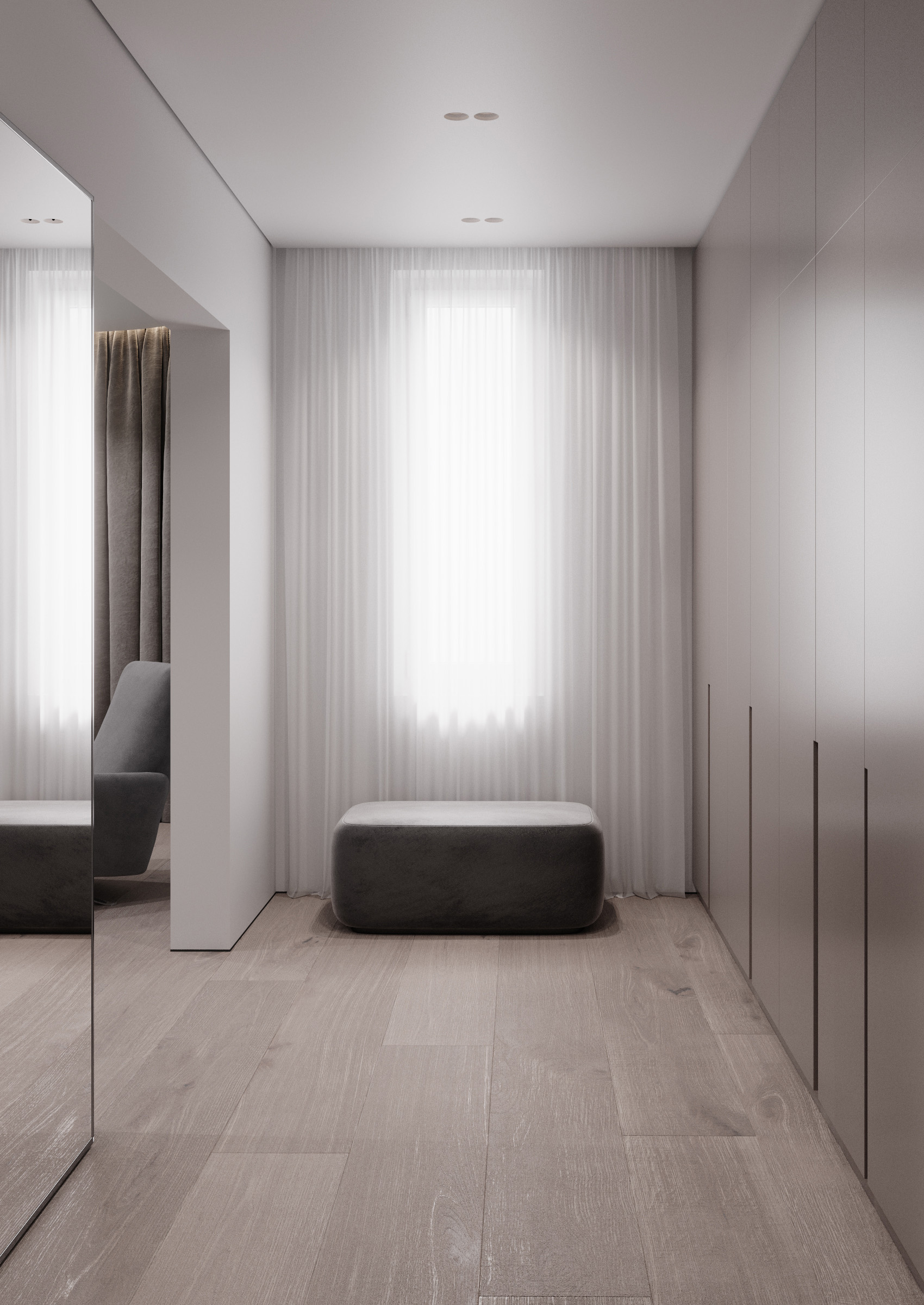 For the bedrooms we have chosen to create an atmosphere of total calm. We kept the same three basic colours: white, beige and grey, excluding the eccentric décor and relying on the simplicity of the premise arrangement that offers the possibility to relax without allowing the details to distract your attention.