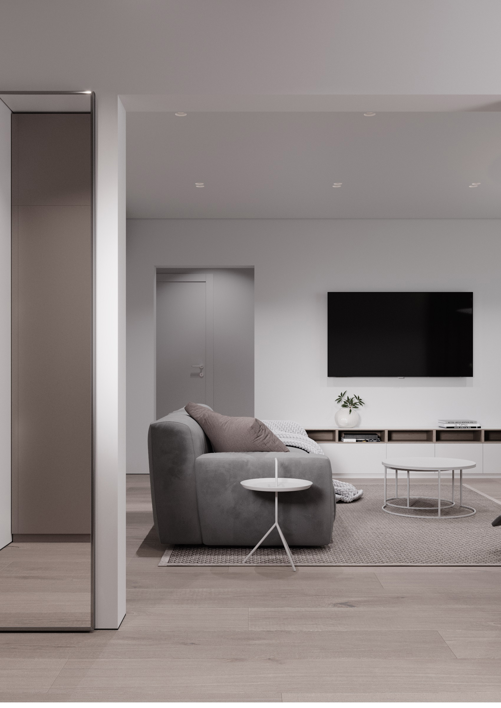 Pastel colours, lots of light and simple shapes. A modern apartment is often a combination of calm elements that offer plenty of comfort. Such is the project below. Bright white, warm grey and fine texture of wood create an aesthetic harmony, soft furniture offers comfort and relaxation, while large windows pamper the interior with the gentle rays of the sun.