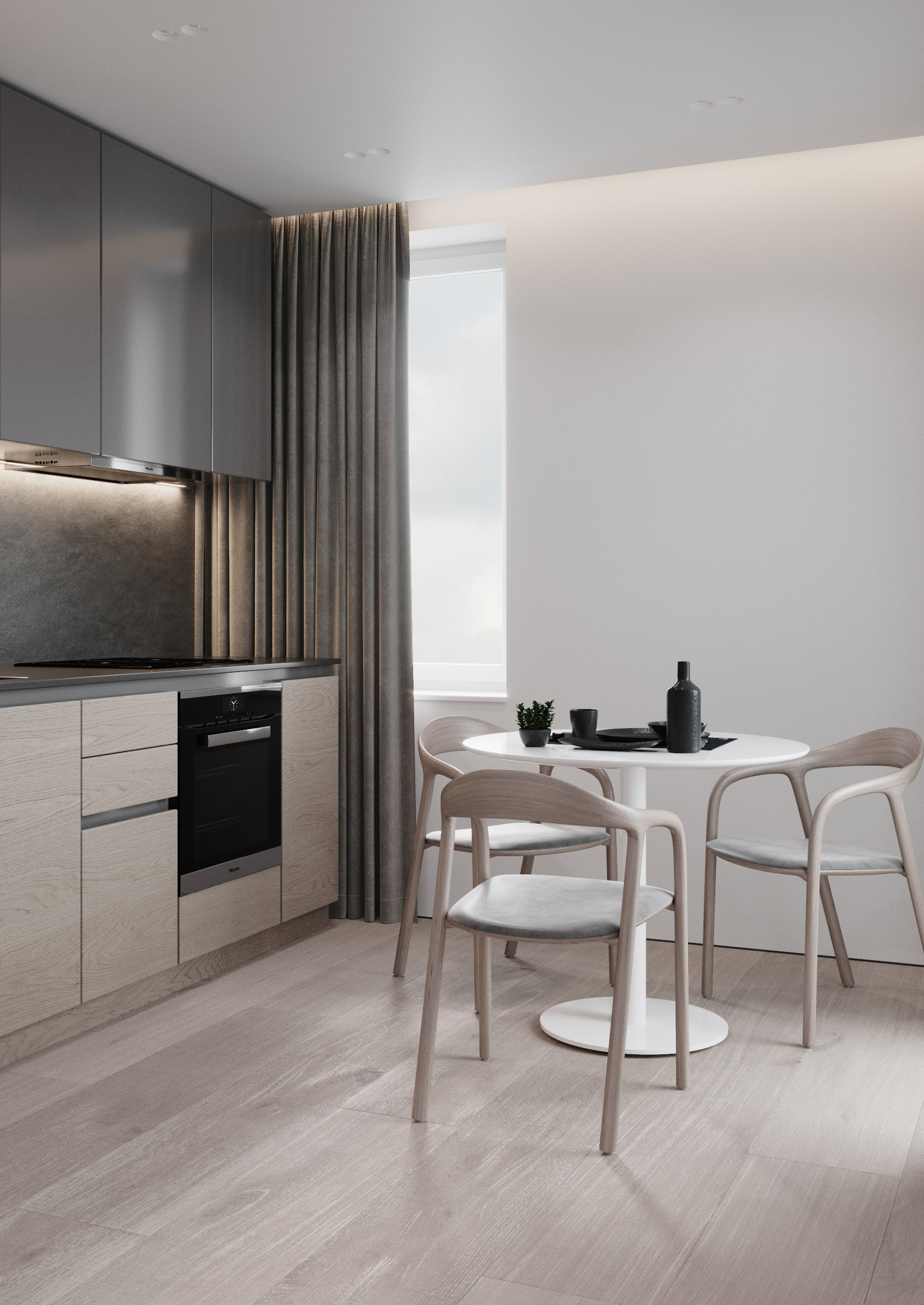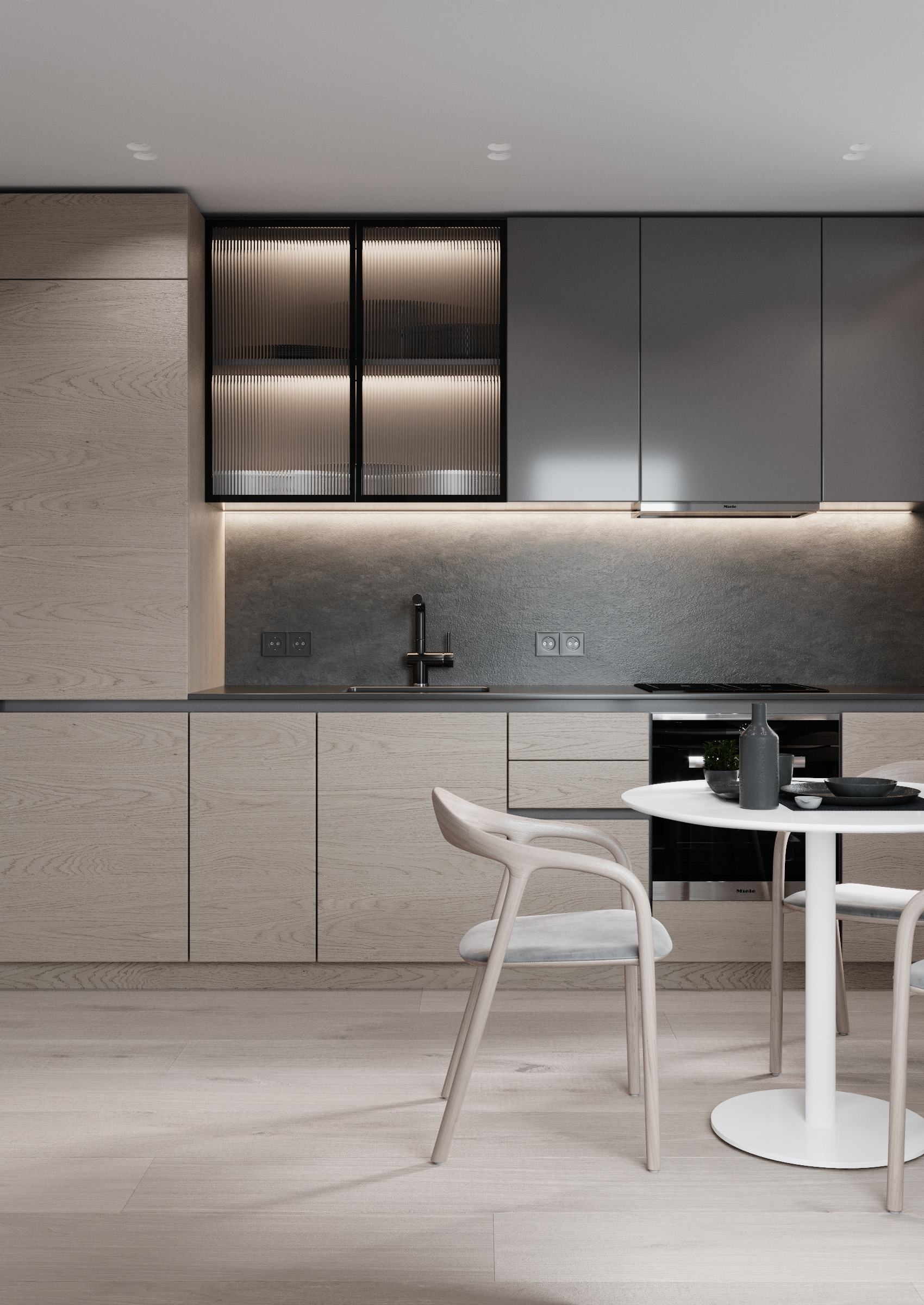 The kitchen is isolated from the common space – here dominates the texture of the wood, which gives the premise a feeling of naturalness. The curved lines of the chairs, as well as the round table dissolve the air of strictness of the room. We kept the walls white and added dark grey accents to the kitchen body.