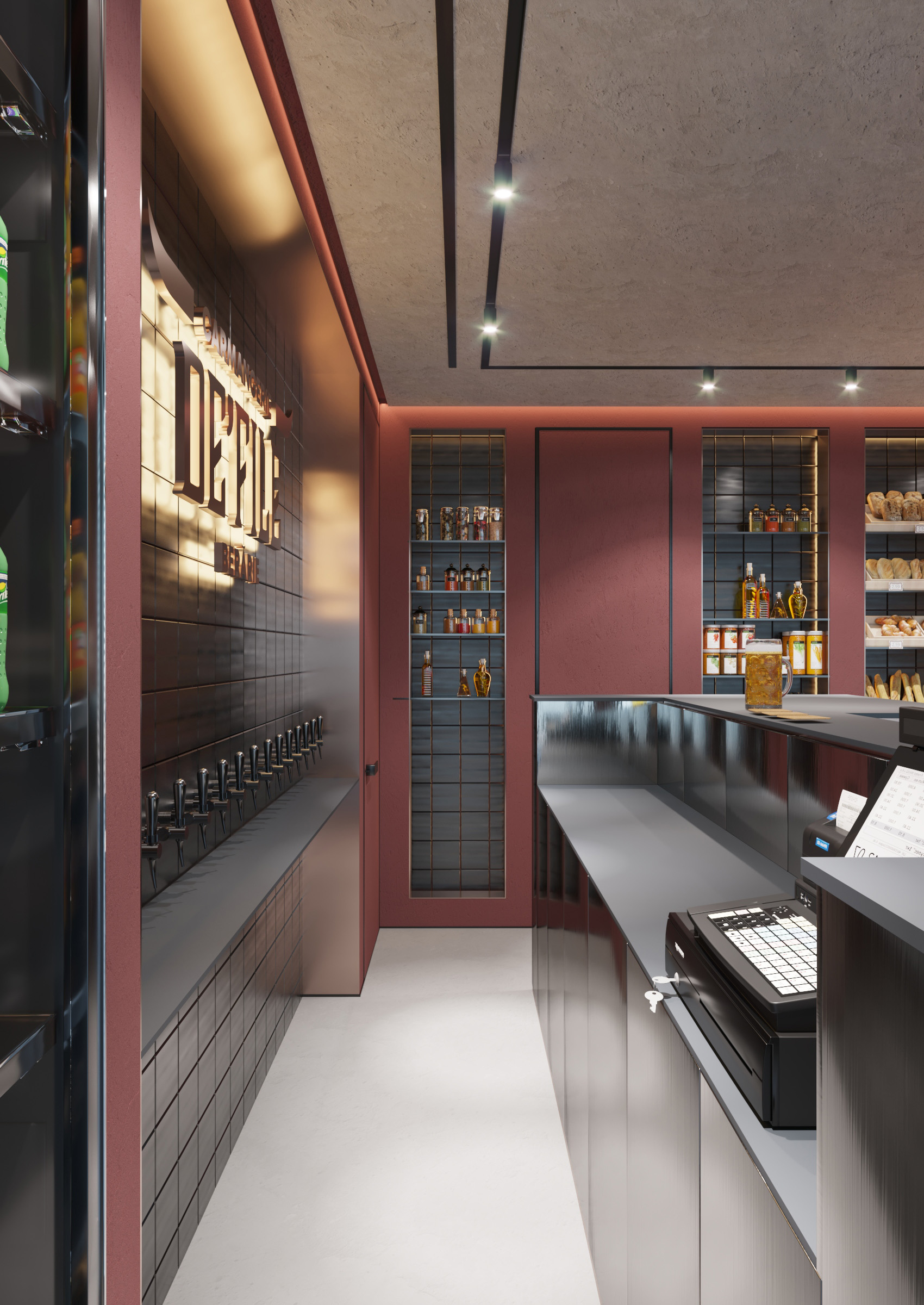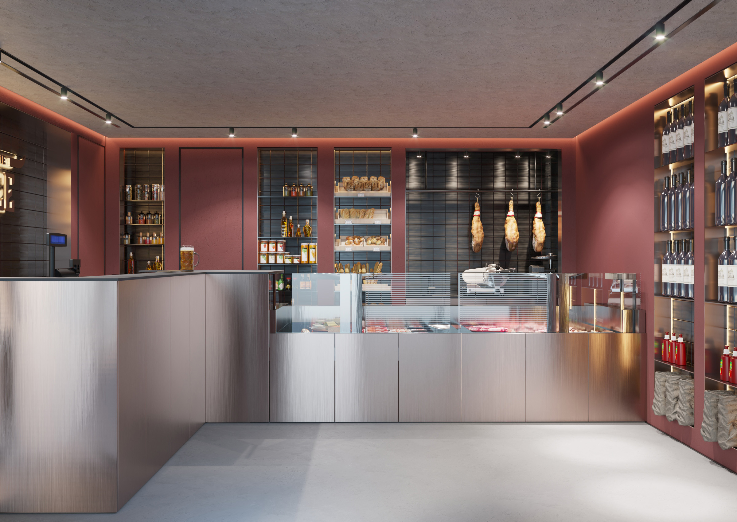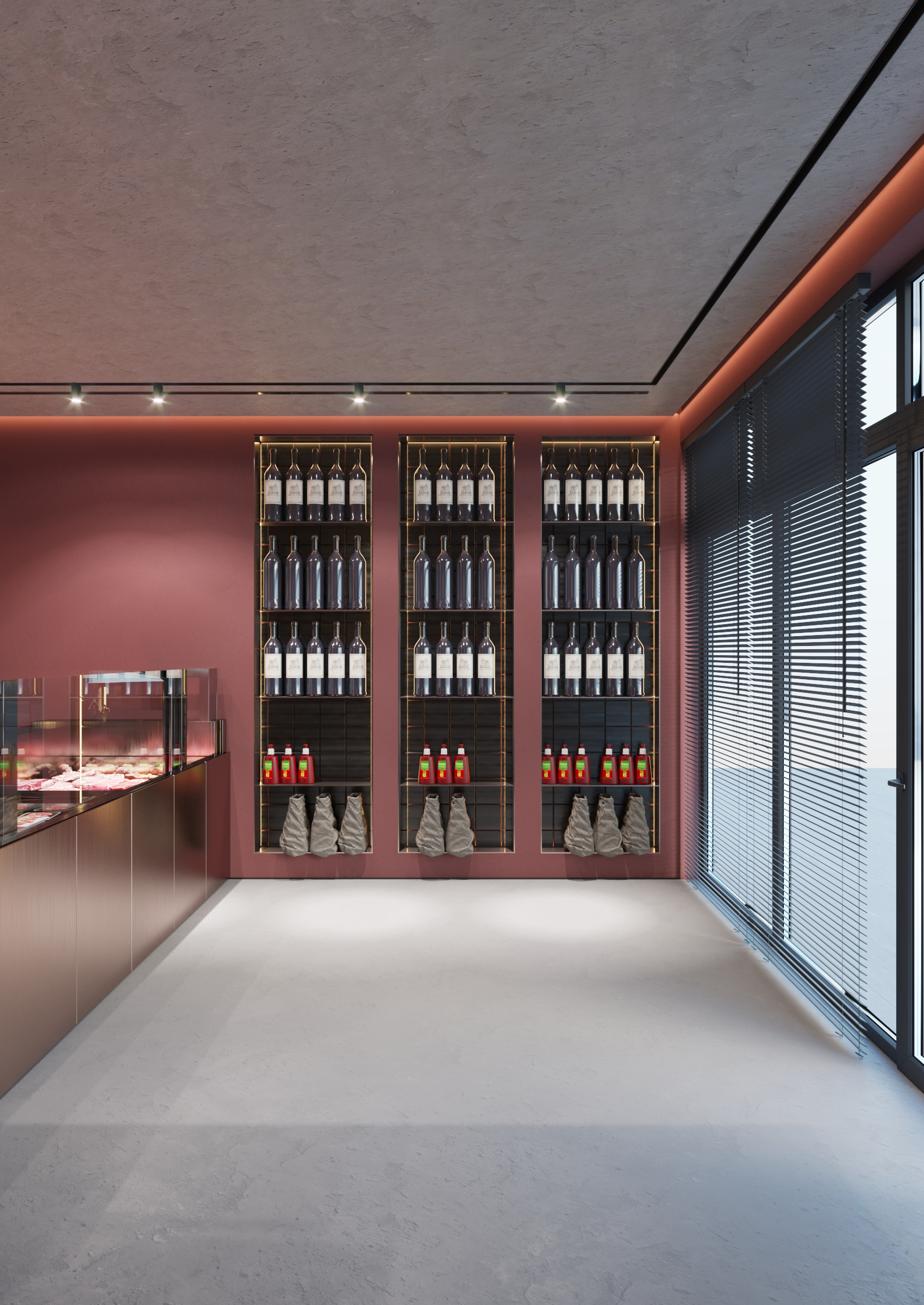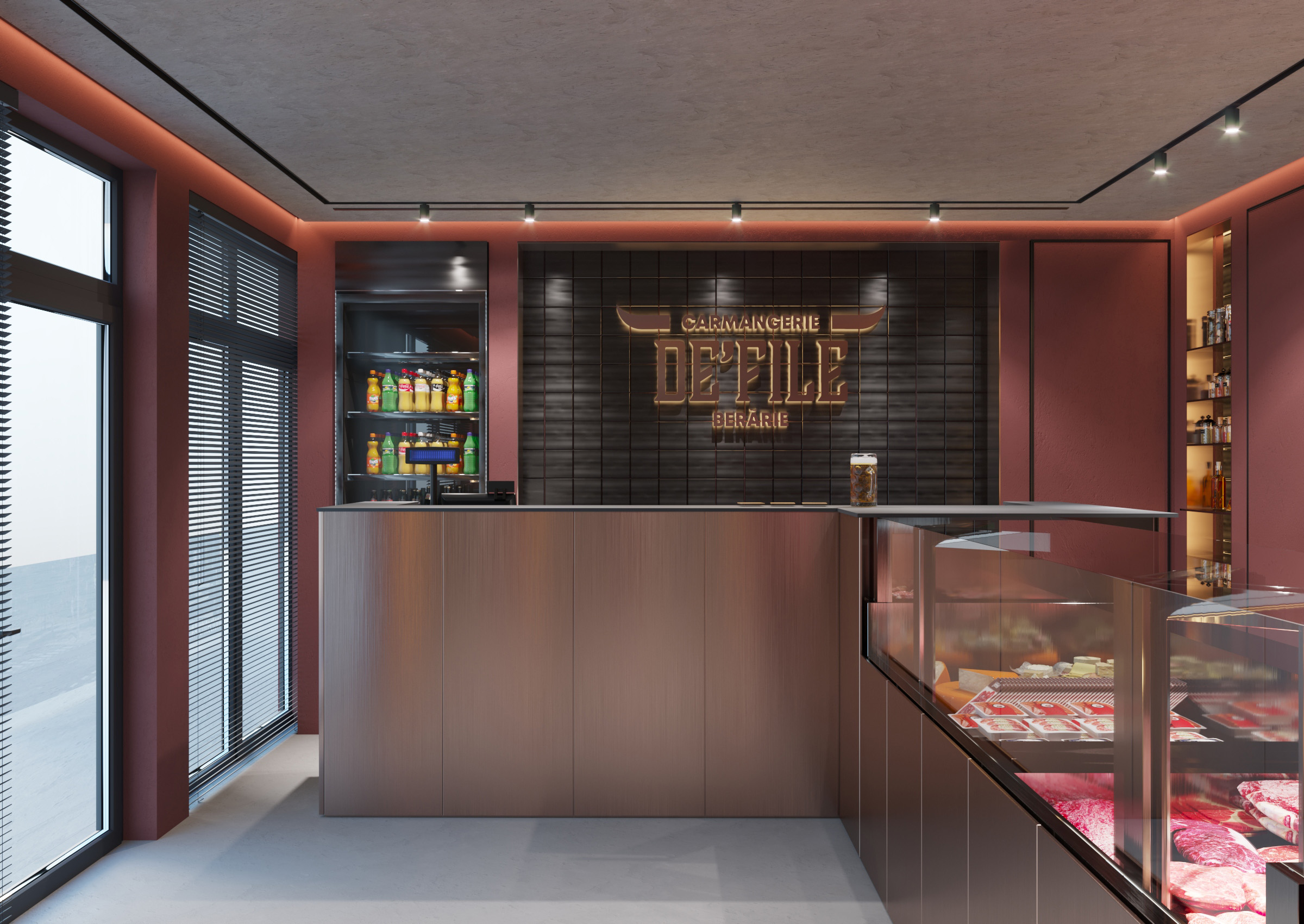 Having a limited space, we gave up the details of décor and arranged the showcases on the perimeter of the butchery, so as to offer enough space for visitors to move around. Zoning was one of the main challenges of the project, but we managed to create a separate space for each category of products. Thus, we placed in the middle the showcase with meat and sausages, arranging an area for selling wine and beer on its left and right sides. Everything was created with the help of succinct lines and strategic lighting.