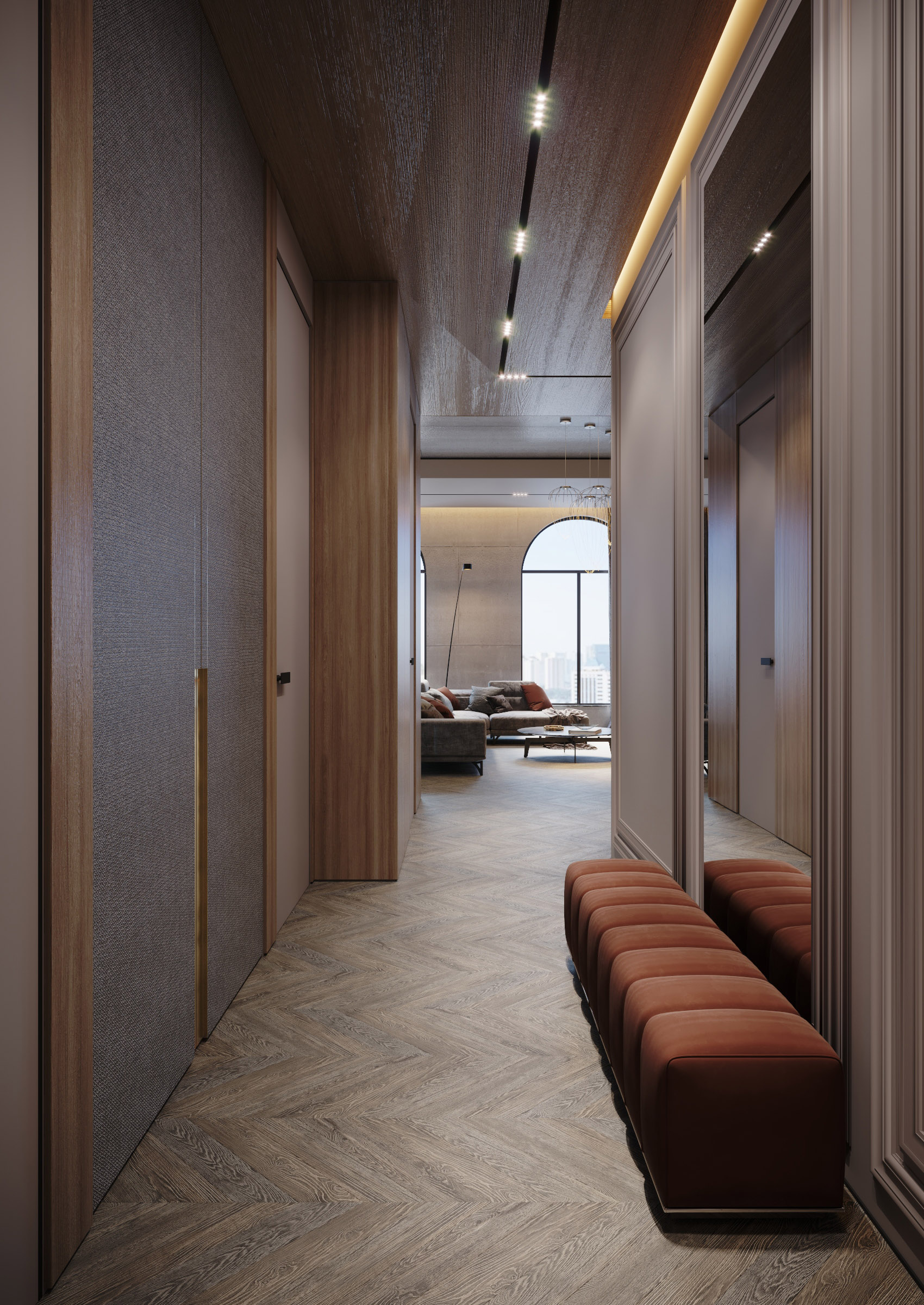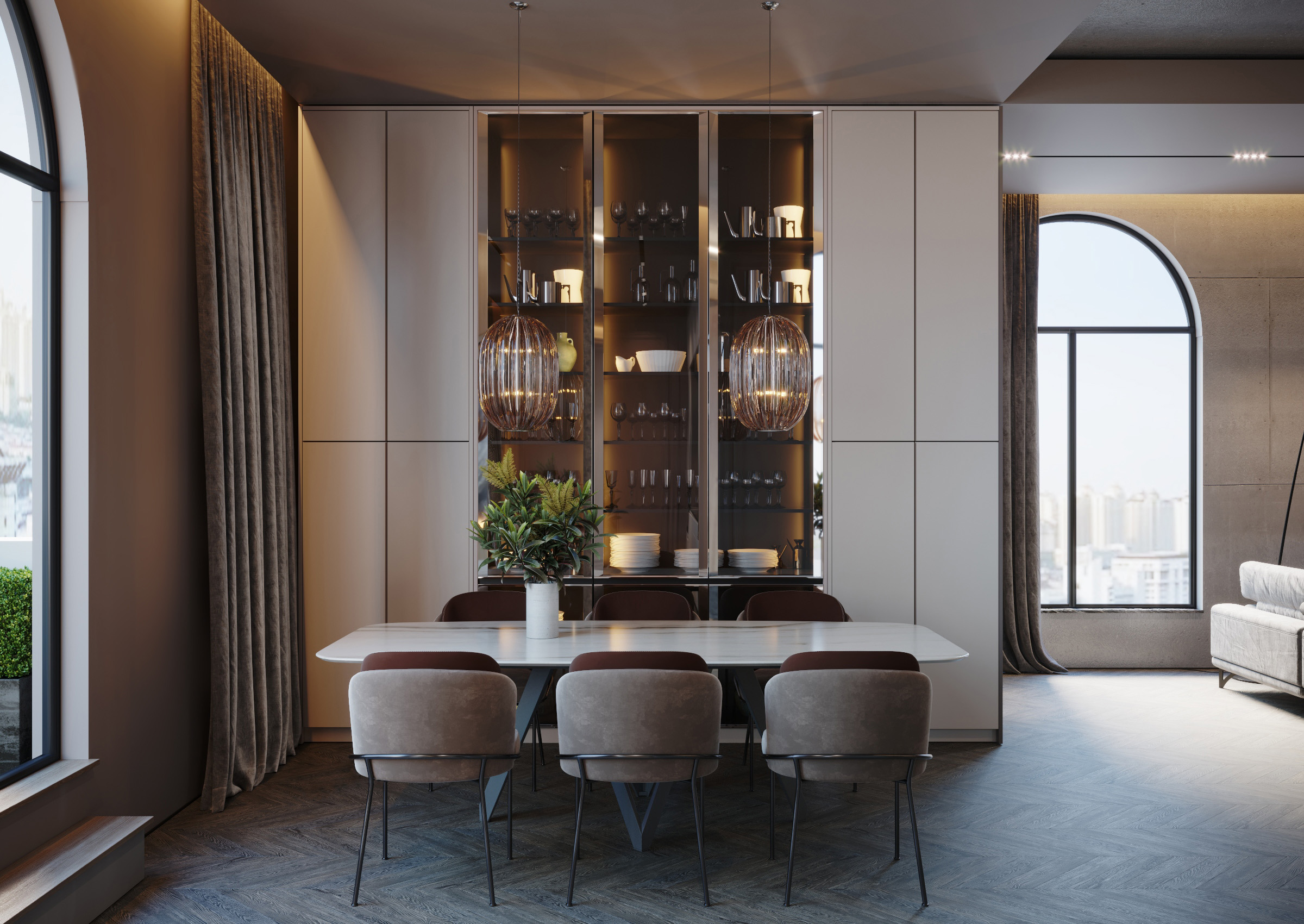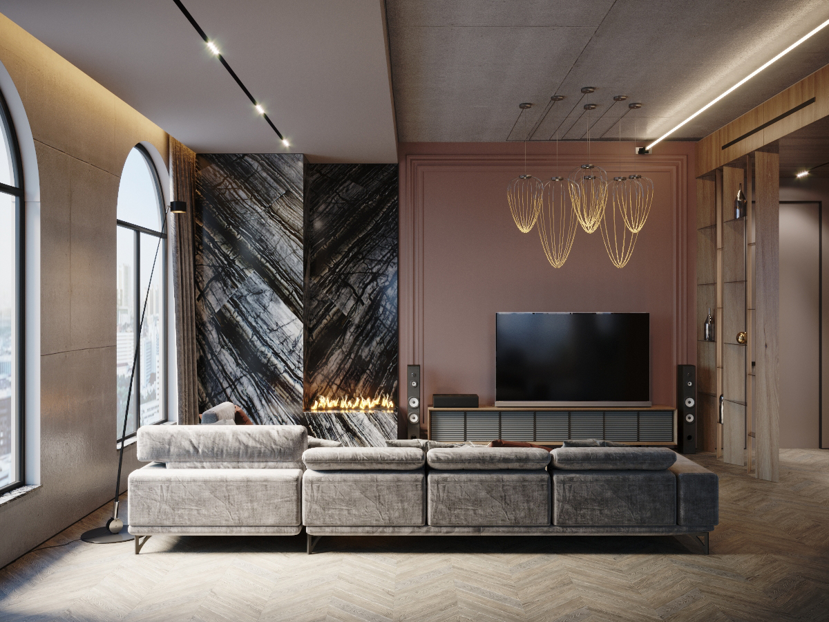 The interior of this penthouse implies privacy and space. The project was designed to combine two notions that seem to be opposed. And this tandem characterizes the entire house, being harmoniously complemented by large windows that become the main accent with classic shades. In addition to the fact that they allow the light to penetrate in abundance, they serve as an elegant antithesis to concrete walls.