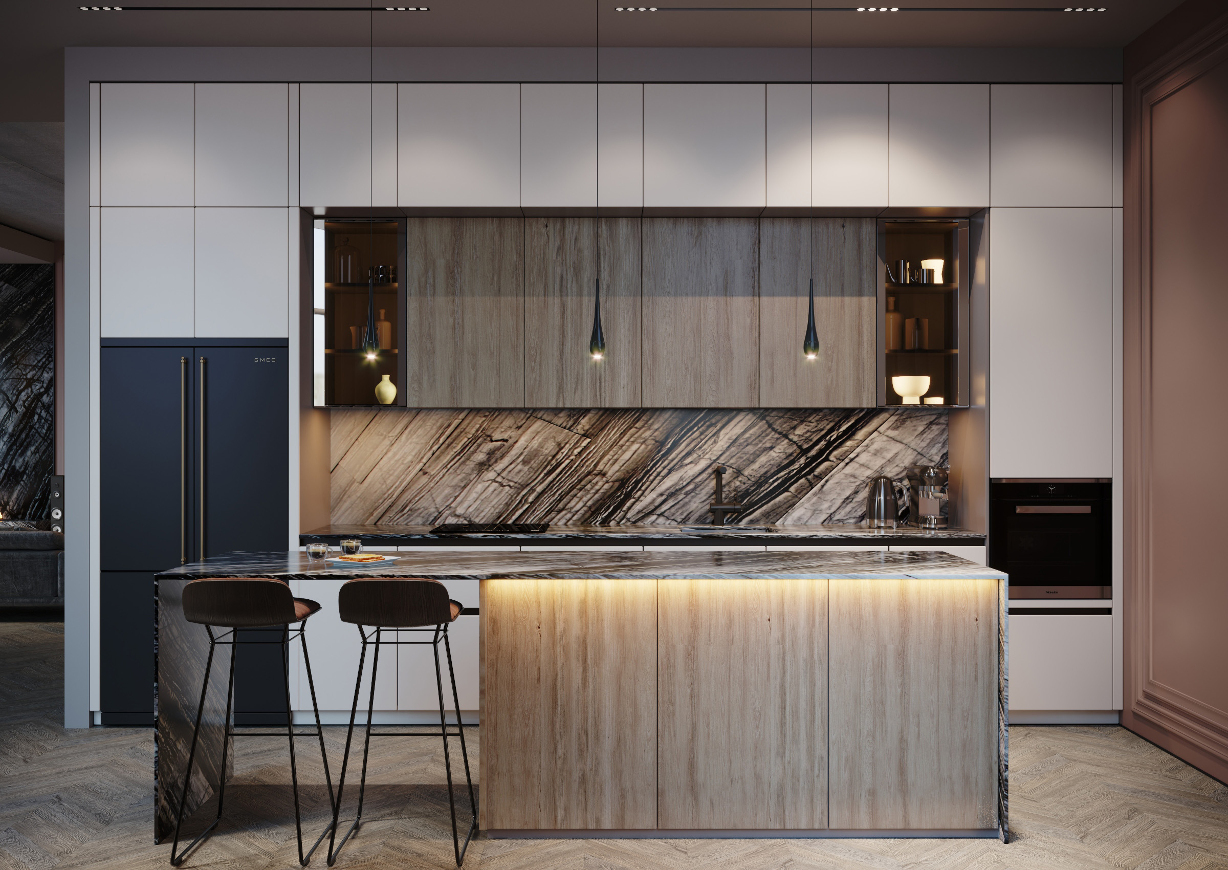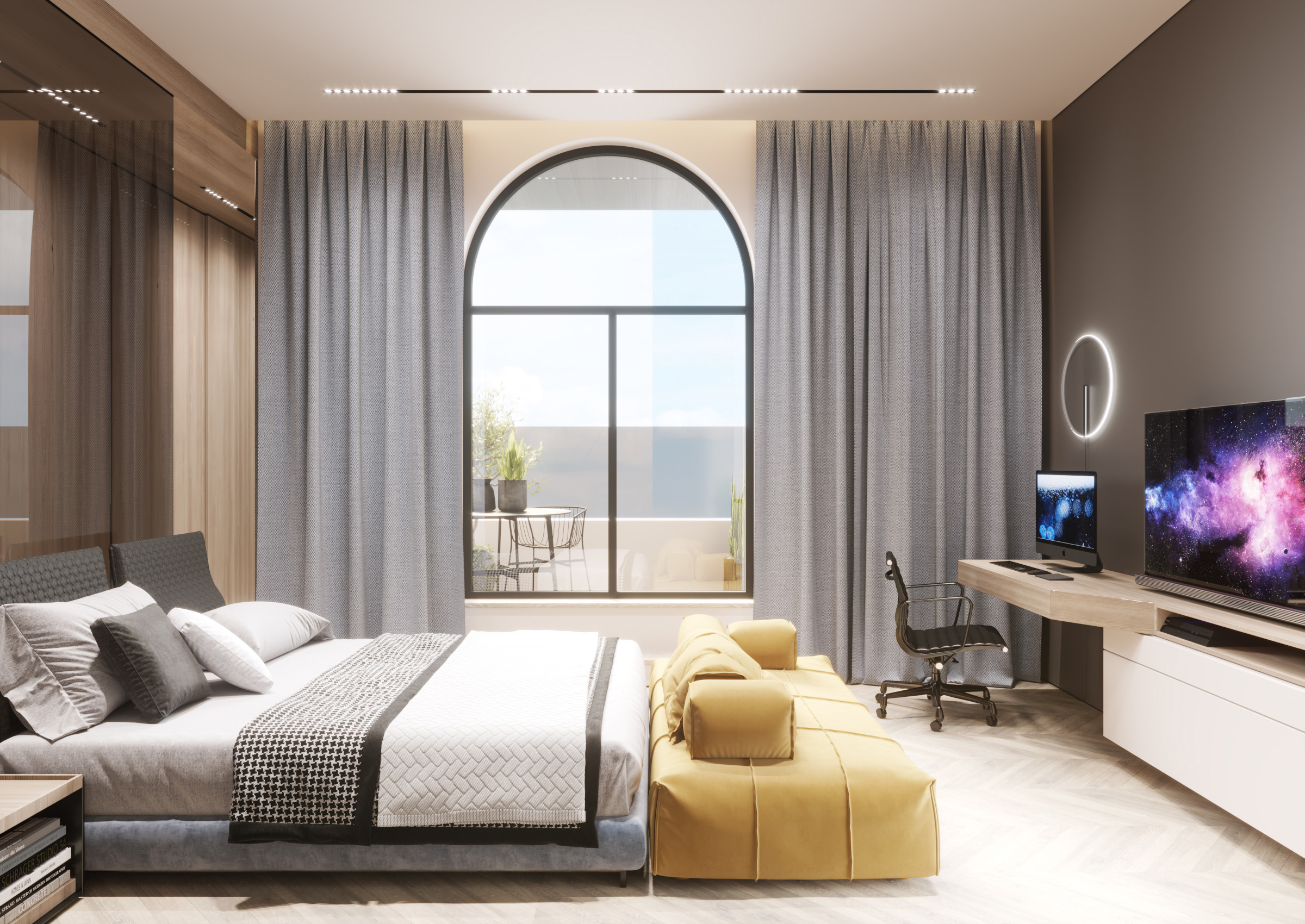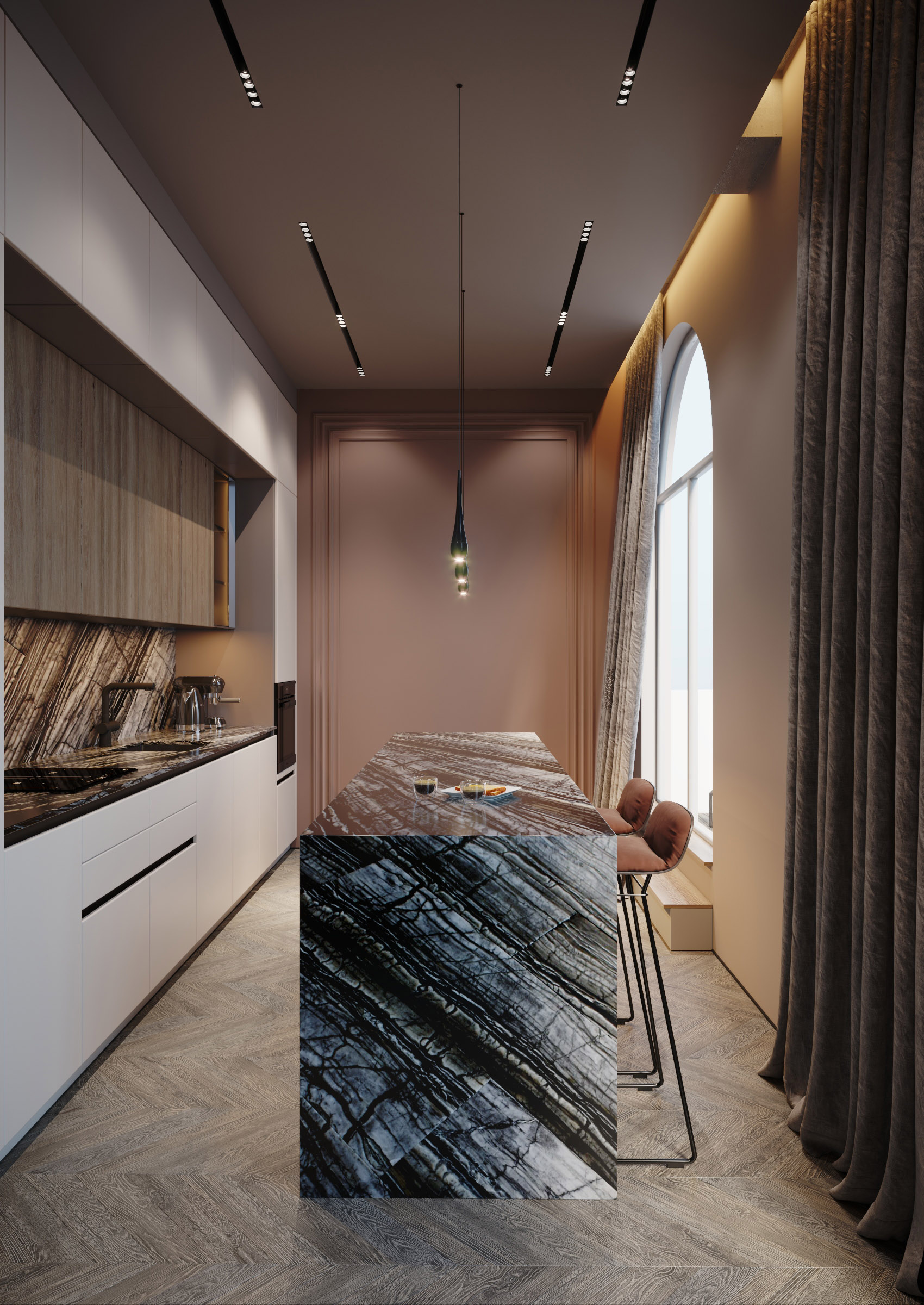 The interior of this penthouse implies privacy and space. The project was designed to combine two notions that seem to be opposed. And this tandem characterizes the entire house, being harmoniously complemented by large windows that become the main accent with classic shades. In addition to the fact that they allow the light to penetrate in abundance, they serve as an elegant antithesis to concrete walls.