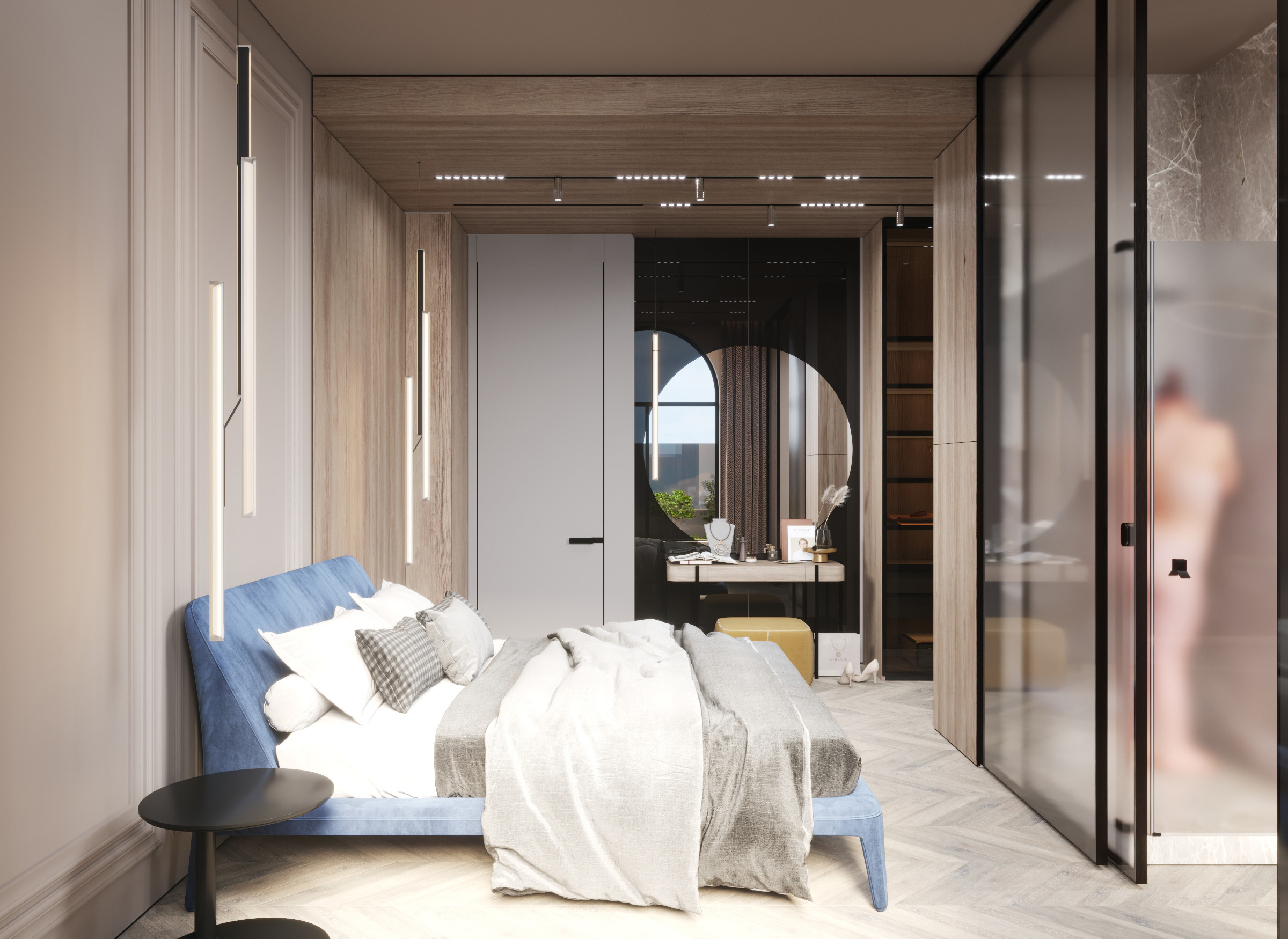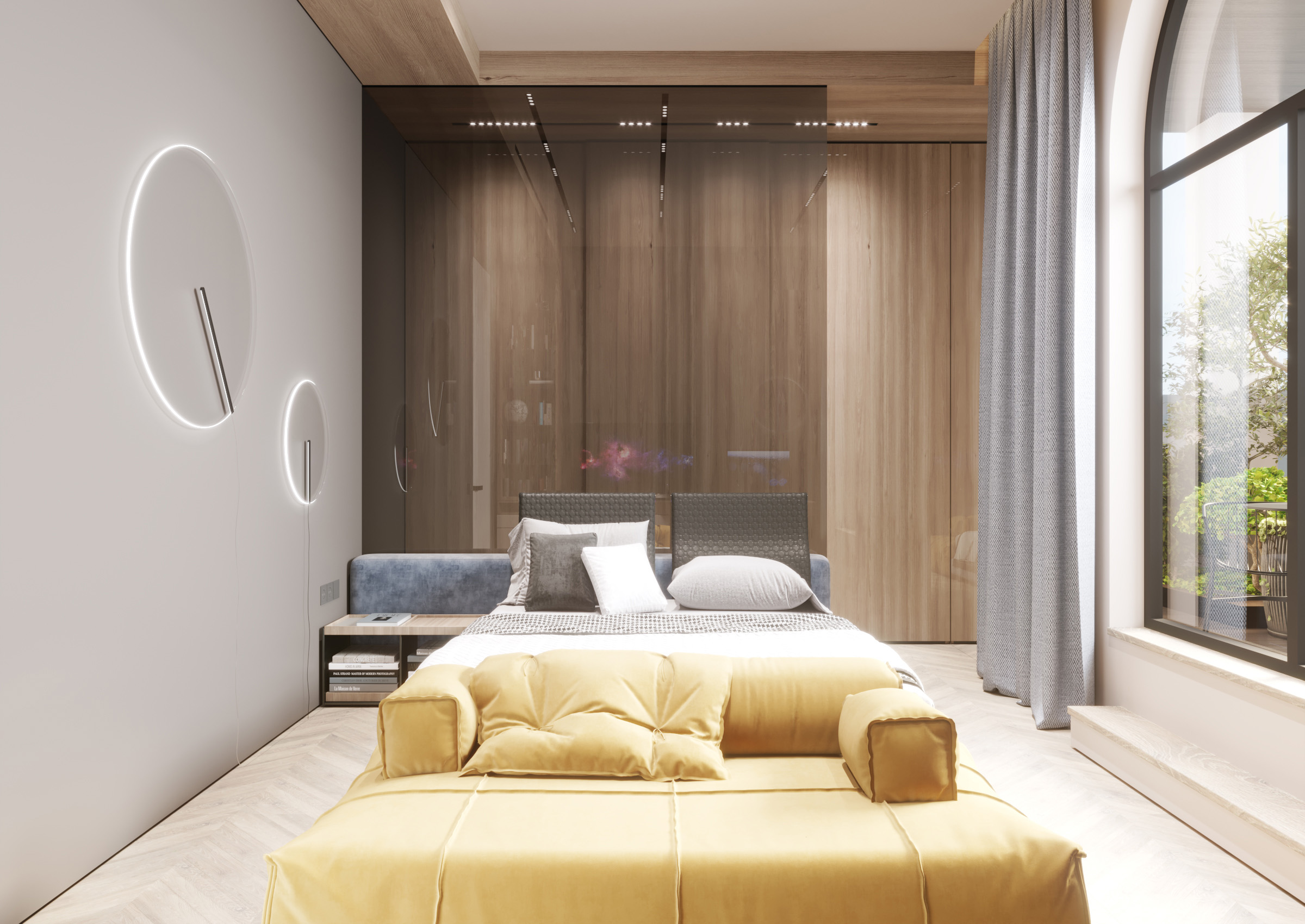 The generosity of the space is also present in the bedrooms. Here, the privacy acquired more accentuated shadows of naturalness. Dominated by wood and calm hues, the rooms are accompanied by glass details, which give transparency to the premises.
