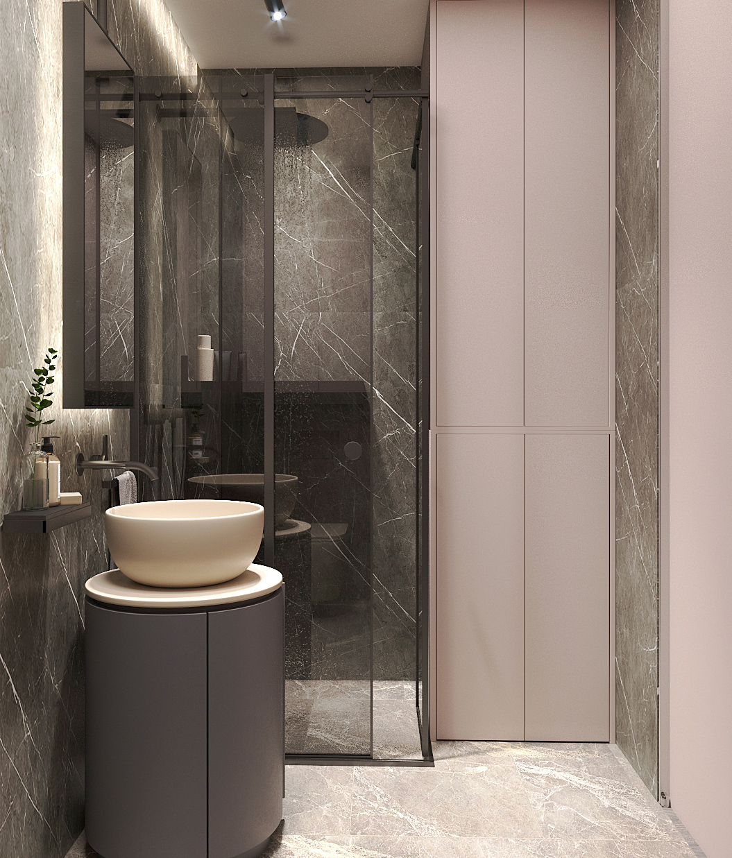 The living area is marked by the popular open space, which unites the kitchen, dining room and living room into a common space. The ceramic tiles, which dominate this premise, ennoble it with their warm colour range and glossy appearance. For bedrooms we have chosen warmer materials, which perfectly match chromatically. And the scenographic lighting, meant to highlight each area, becomes a touch of luxury.