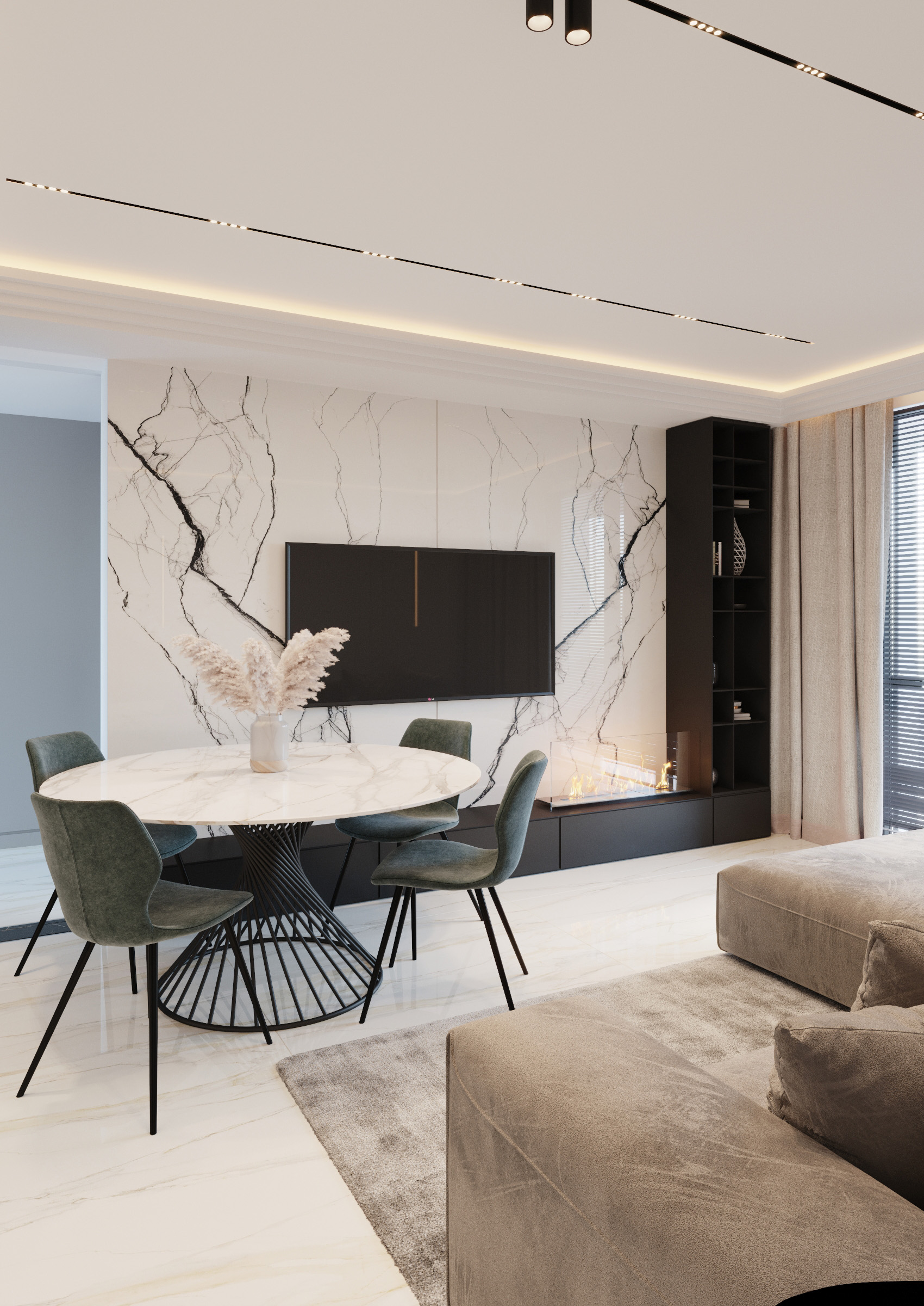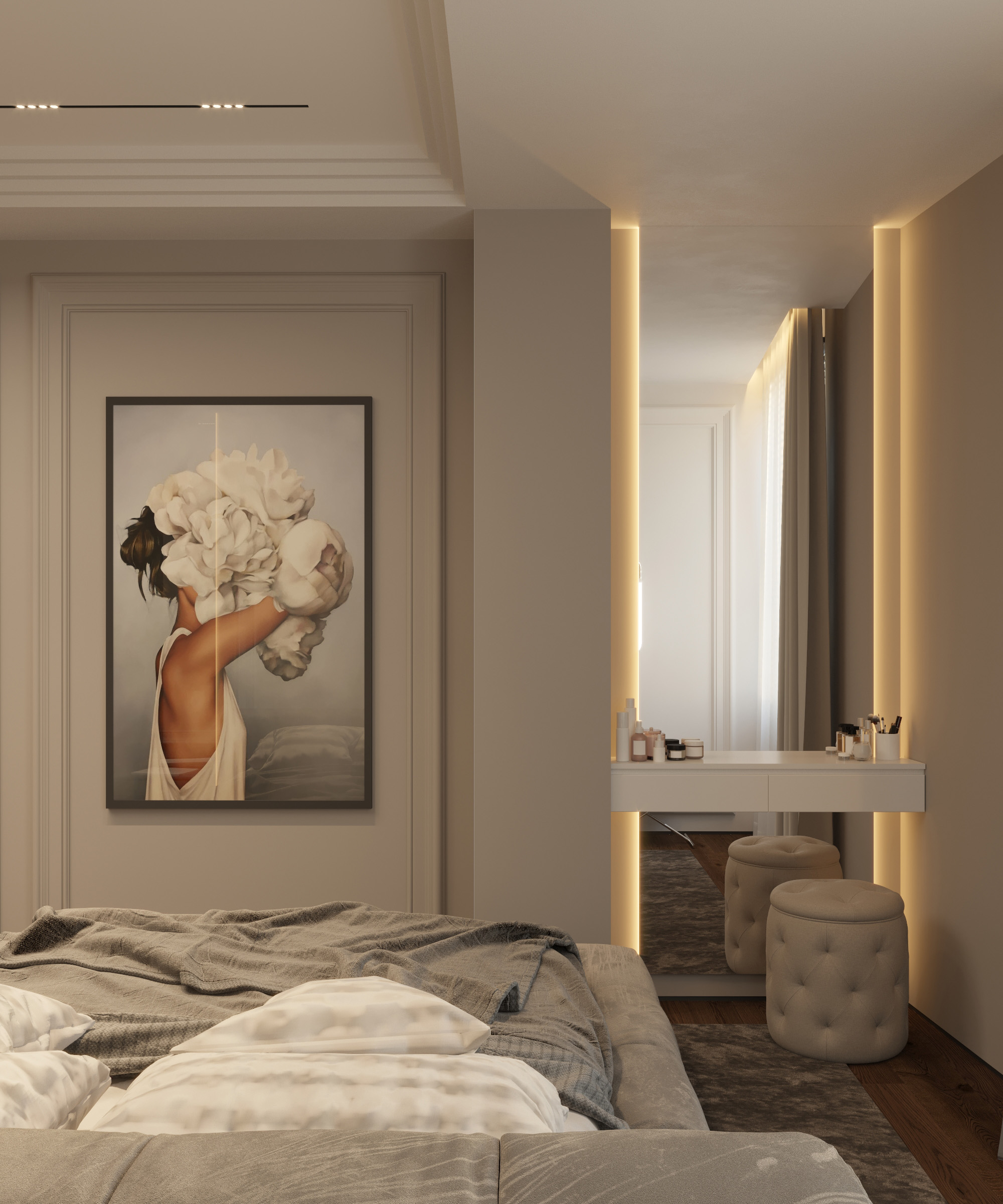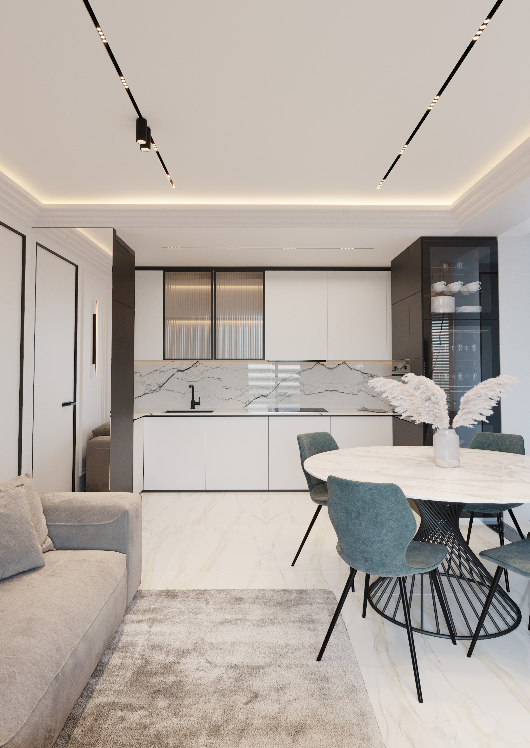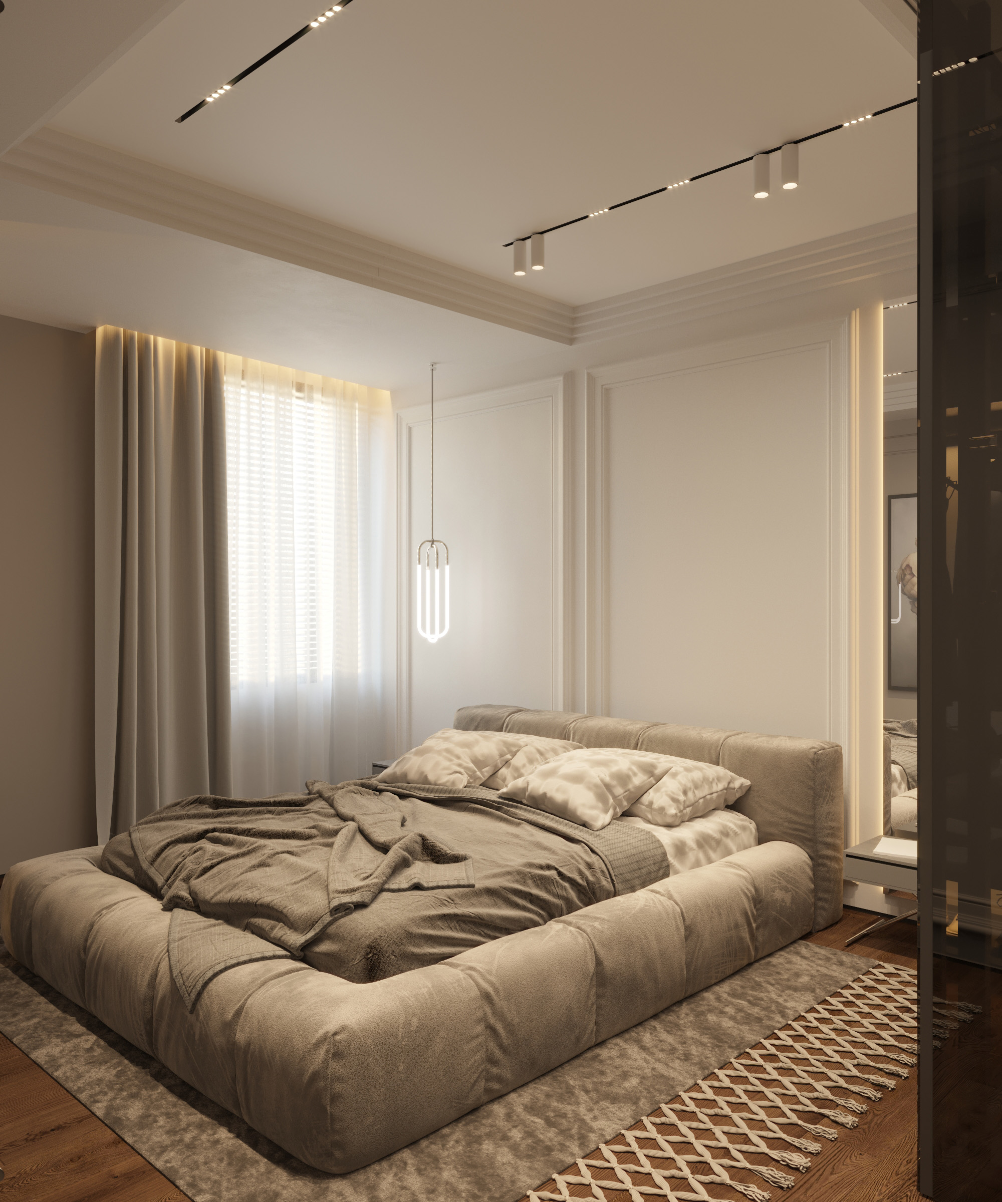 In the project below, neutrality has become a guarantor of convenience. We opted for light hues that offer the feeling of freedom and space. We wanted to create a relaxing atmosphere that is full of comfort and light without excessive colours and eccentric accents. We have created a modern stylistic line, in which we combined a minimalist atmosphere with subtle neoclassical accents.