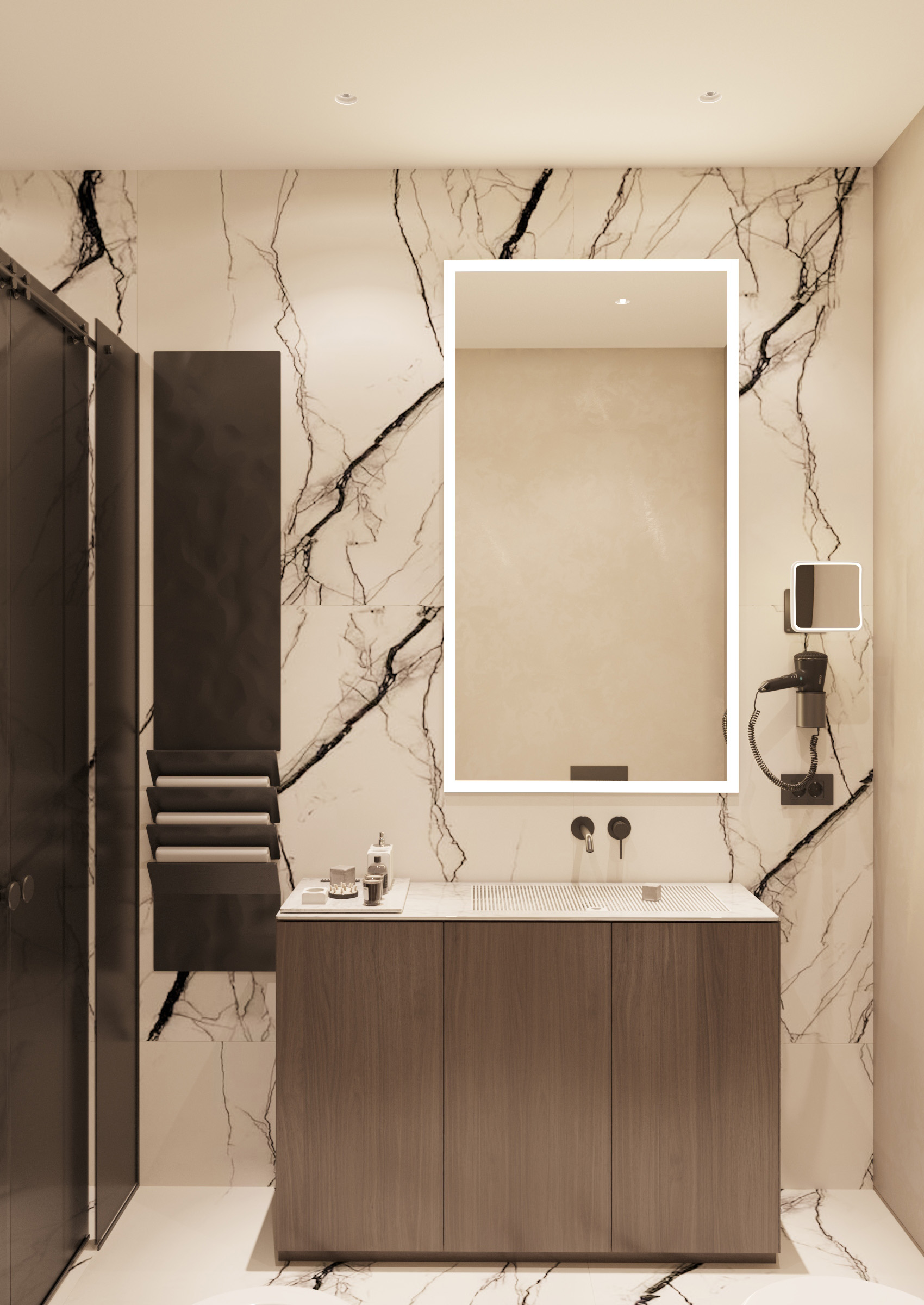 The diversity of the premises we had to arrange, allowed us to use a complex approach to them. The general concept of the project provides for a neutral colour range and a set of textures, individually combined according to the destination of the room.