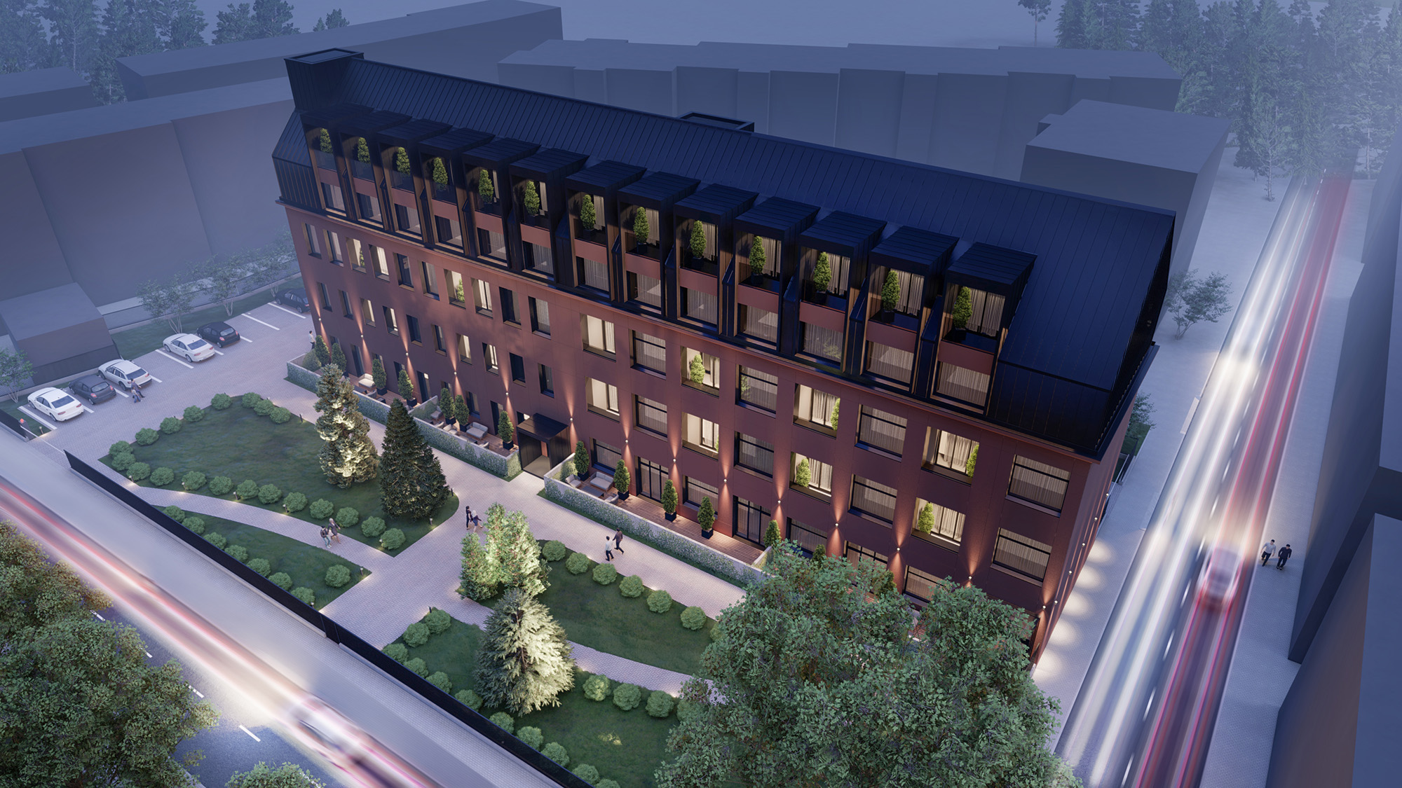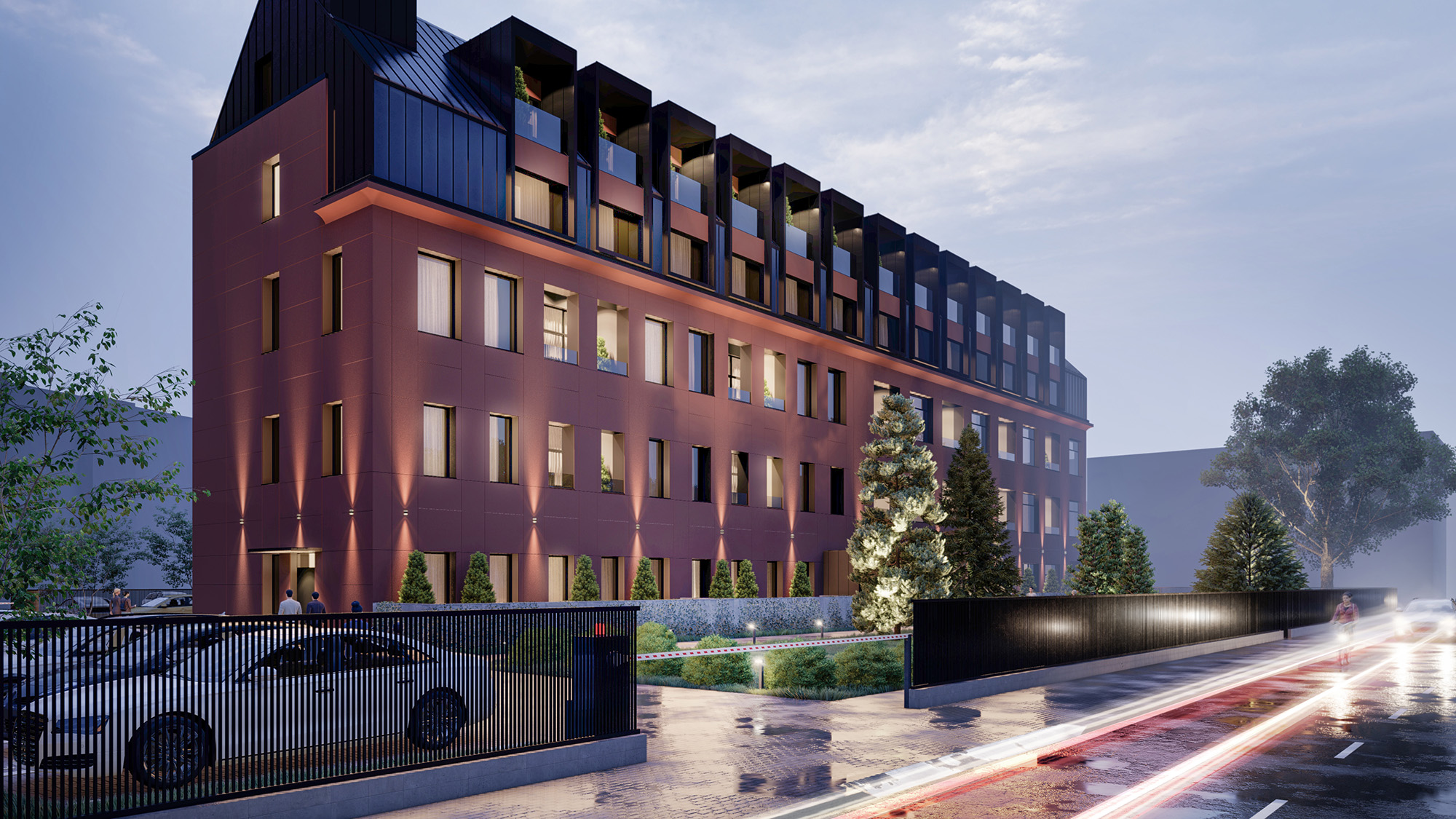 The transformation of the old industrial space into a modern residential one meant, of course, the use of state-of-the-art materials, such as profiled sheet with thermal insulation, waterproofing and sound-absorbing coefficients. We also opted for a ventilated façade, which allows air circulation from the façade, thus raising the thermal coefficient. We also have a modern drainage system integrated in the façade.