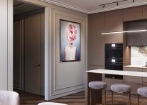 Deși nuanțele utilizate nu sunt reci, spațiul a fost completat cu detalii menite să îi dea și mai multă căldură și comoditate. Am adăugat textile – draperii, covor și o canapea tapițată cu textil. De asemenea, ca accente, în zona de zi, au apărut tablouri și ancadramente în stil clasic. Corpurile de iluminat au și ele o importanță majoră, devenind un tribut al clasicului contemporan. Scaunele tapițate cu catifea, unele dintre ele având picioare aurii, îmbină conștiincios funcționalul cu esteticul.