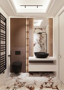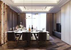 Un design de interior elaborat în stil contemporan, cu influențe ale stilului clasic, proiectul acestui apartament prezintă actualitatea bicromatică în toată amploarea sa. Interiorul este dominat de alb și maro, cel din urmă fiind prezent în diferite nuanțe. Culorile alese dau, din start, impresia unui spațiu nobil și calm. Pentru a confirma senzația, locuința a fost completată cu accente subtile ce se regăsesc în mobilier și decor, în majoritatea camerelor.