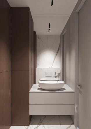 Linia stilistică a designului continuă și în dormitor, unde avem același joc de maro și alb. Aici, însă, pe lângă ancadramente avem accente cromatice în mobilier. Echilibrul dintre cele două culori de vază utilizate garantează intimitate și noblețe. Baia, finisată cu plăci de gresie, ce corespund cromatic cu restul apartamentului, oferă aceleași senzații.