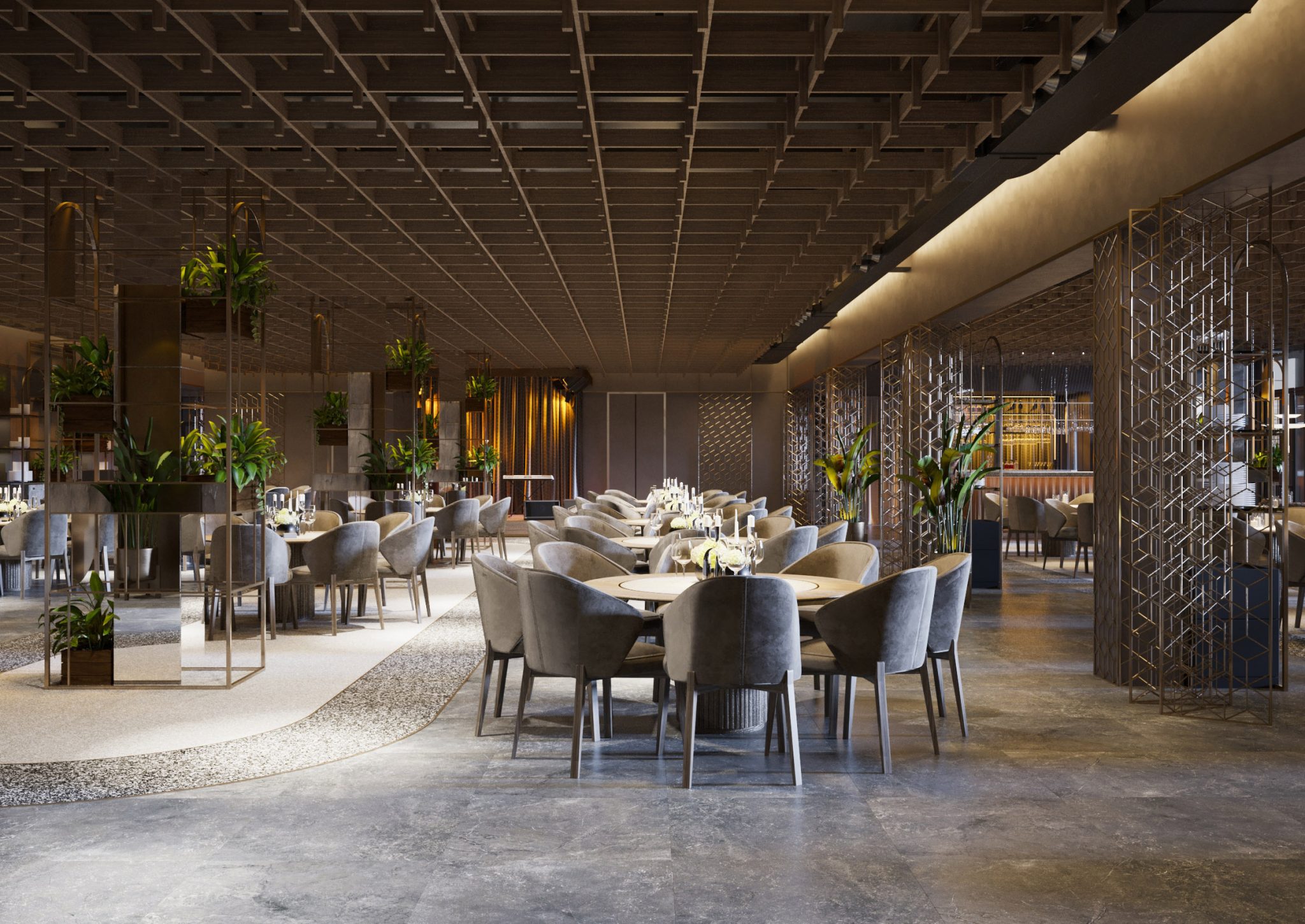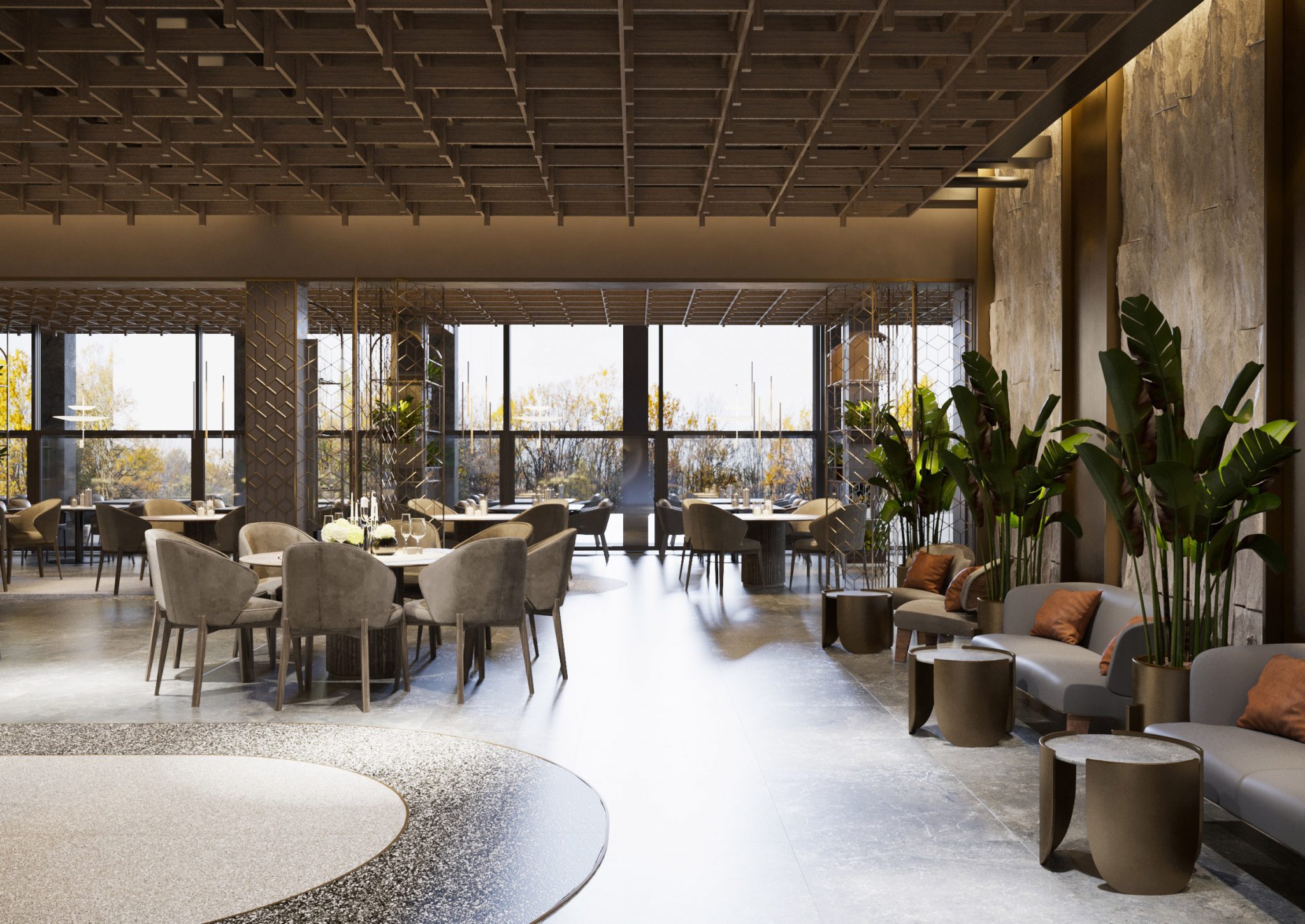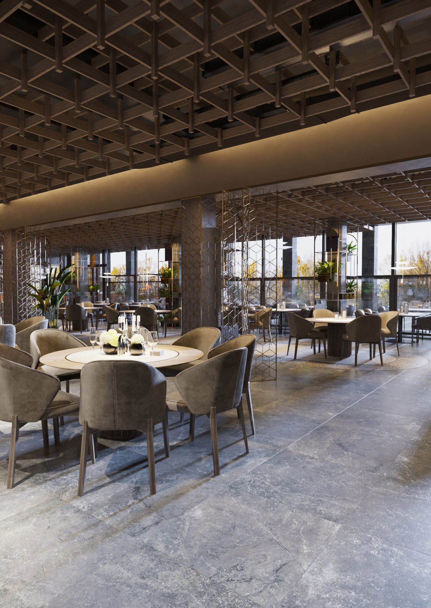 Pentru interior, am mizat pe culori neutre și linii simple, astfel încât să fie garantată comoditatea. Cu o suprafață generoasă, ce poate găzdui peste 250 de oaspeți, restaurantul rămâne a fi luminos. Generozitatea spațiului a impus și o anumită structură, iar pentru a masca pilonii de rezistență și a-i încadra în context, i-am transformat în elemente de decor. Unii dintre ei au fost înconjurați de rafturi metalice, pe care au fost plasate plante, alții – de cadre metalice decorative, a căror elemente urmează motive geometrice în linii drepte. Pentru tavan am utilizat lamele din lemn, pe care le-am unit într-o structură ce acoperă tavanul din întreg restaurantul.