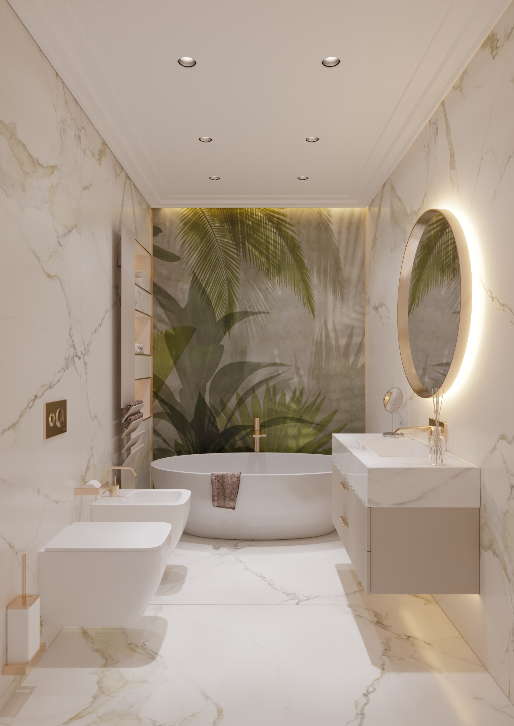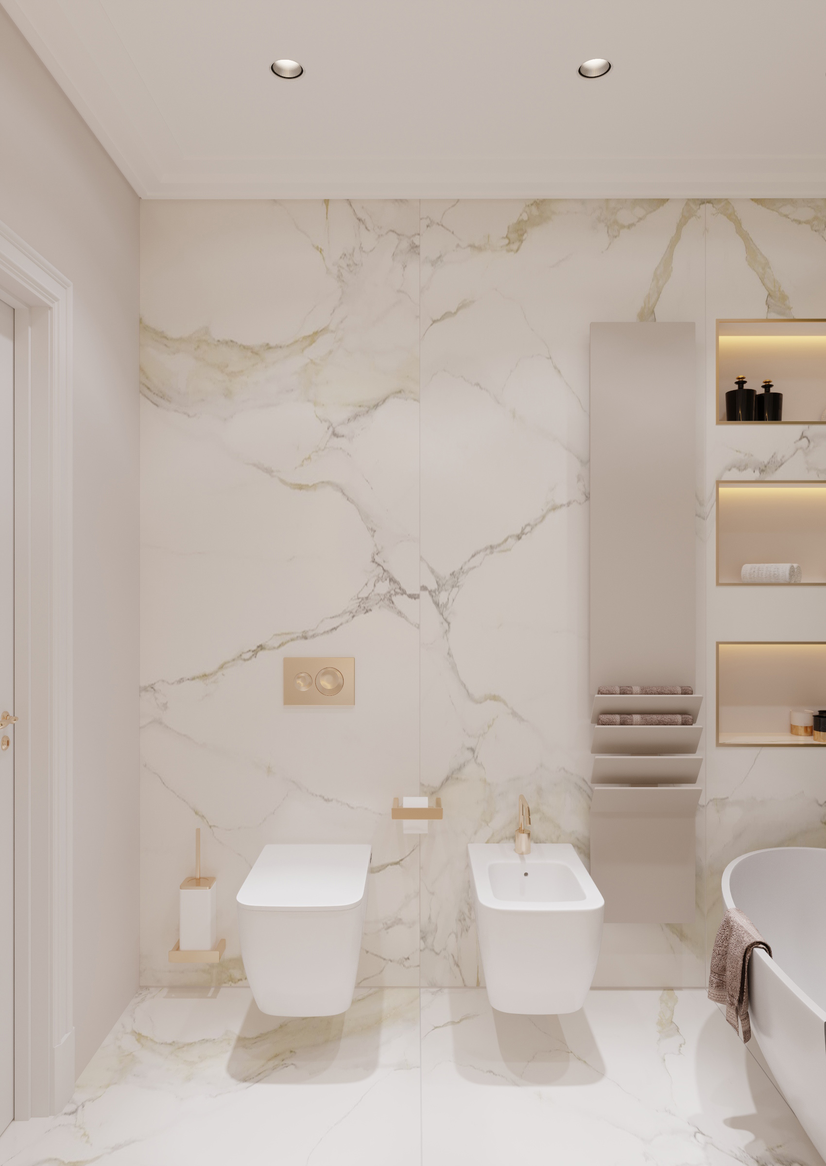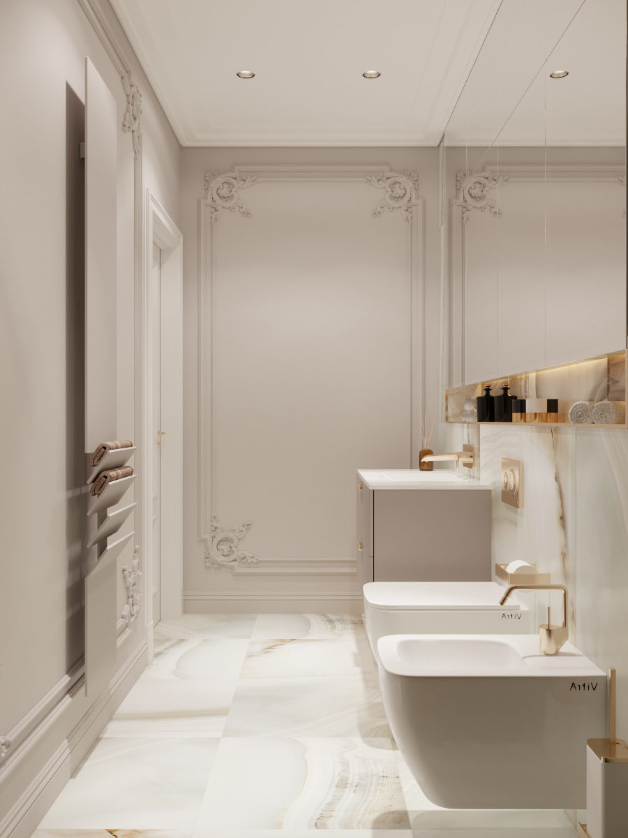 Linia stilistică simplă și nobilă continuă și în băi, unde sunt prezente ancadramentele clasice, detaliile aurii, ceramica și nuanțele neutre.