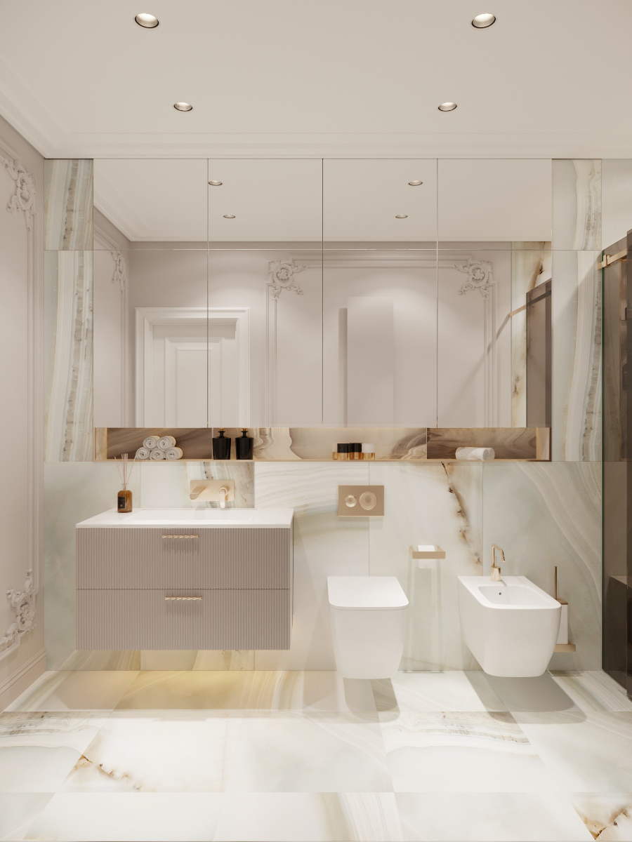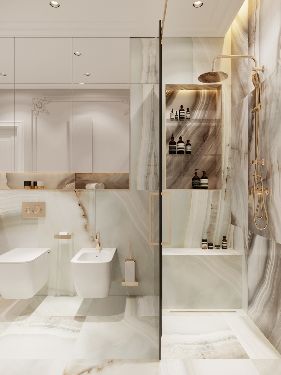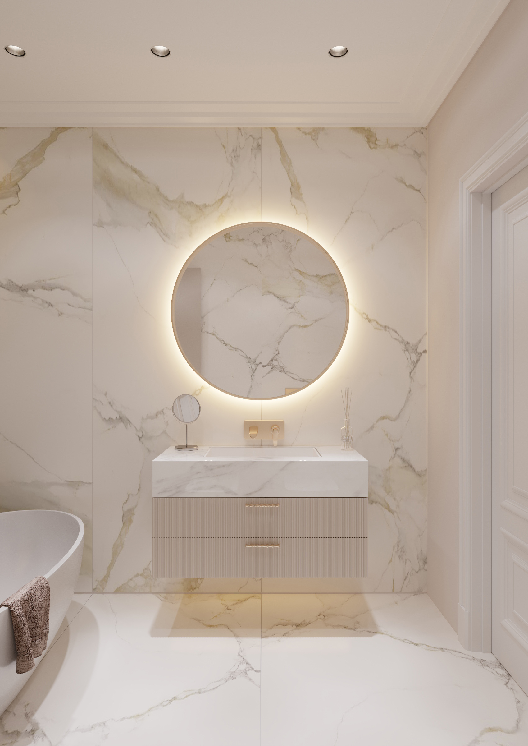 Linia stilistică simplă și nobilă continuă și în băi, unde sunt prezente ancadramentele clasice, detaliile aurii, ceramica și nuanțele neutre.