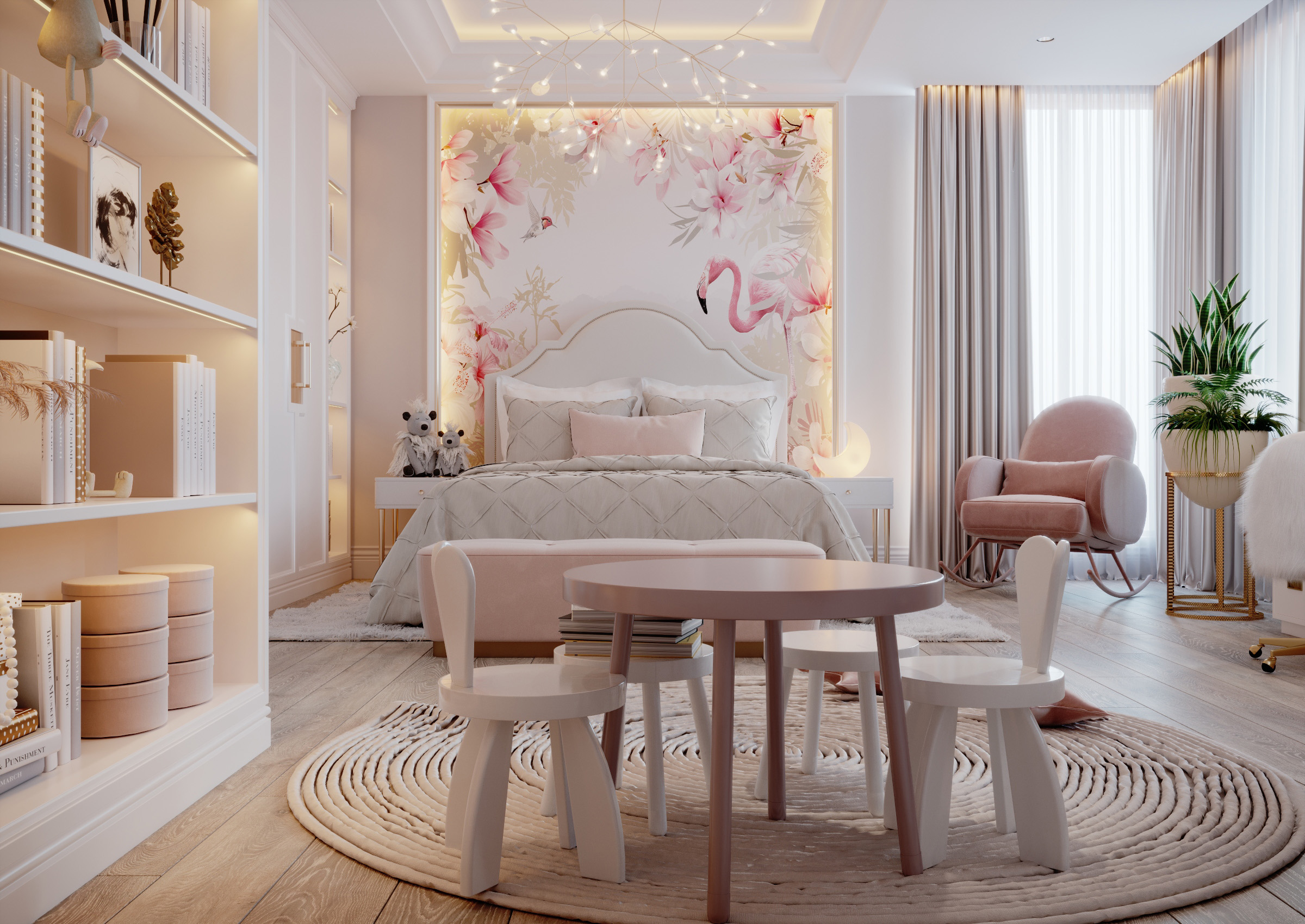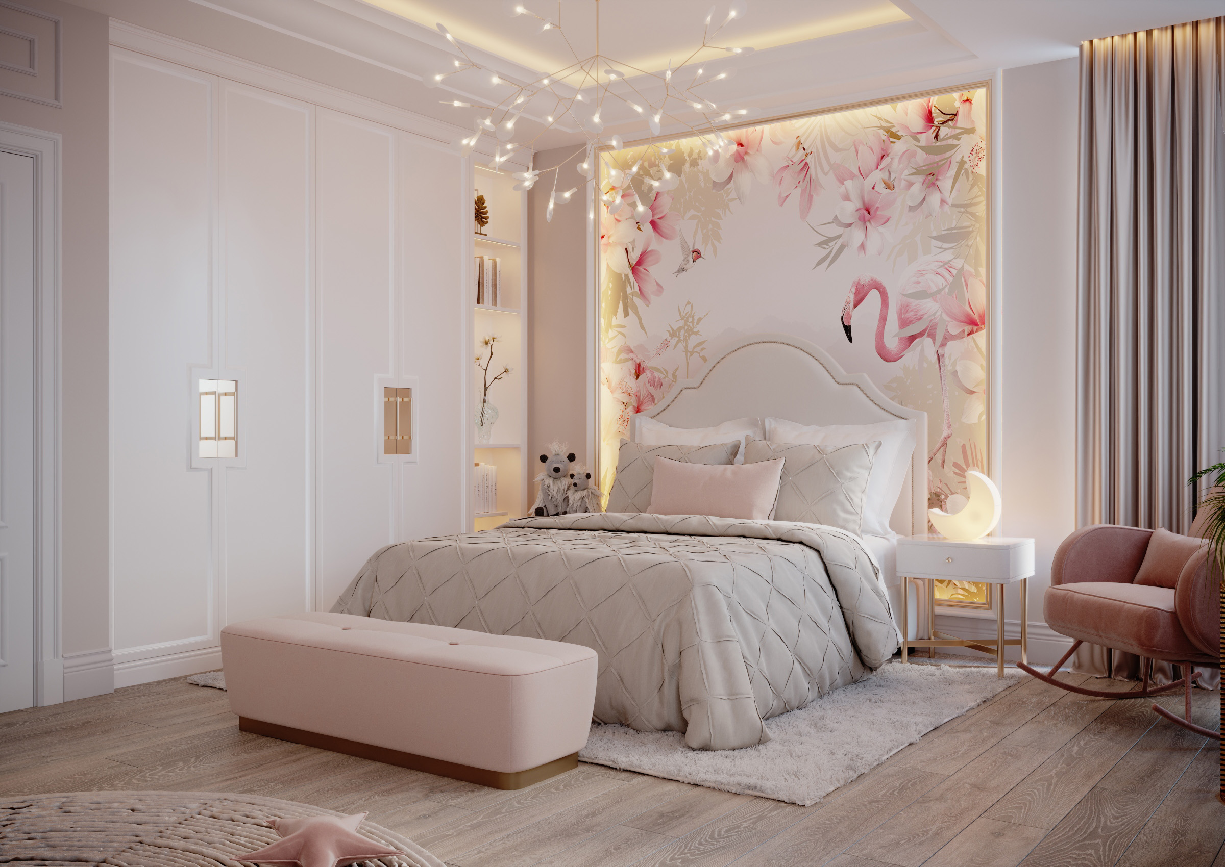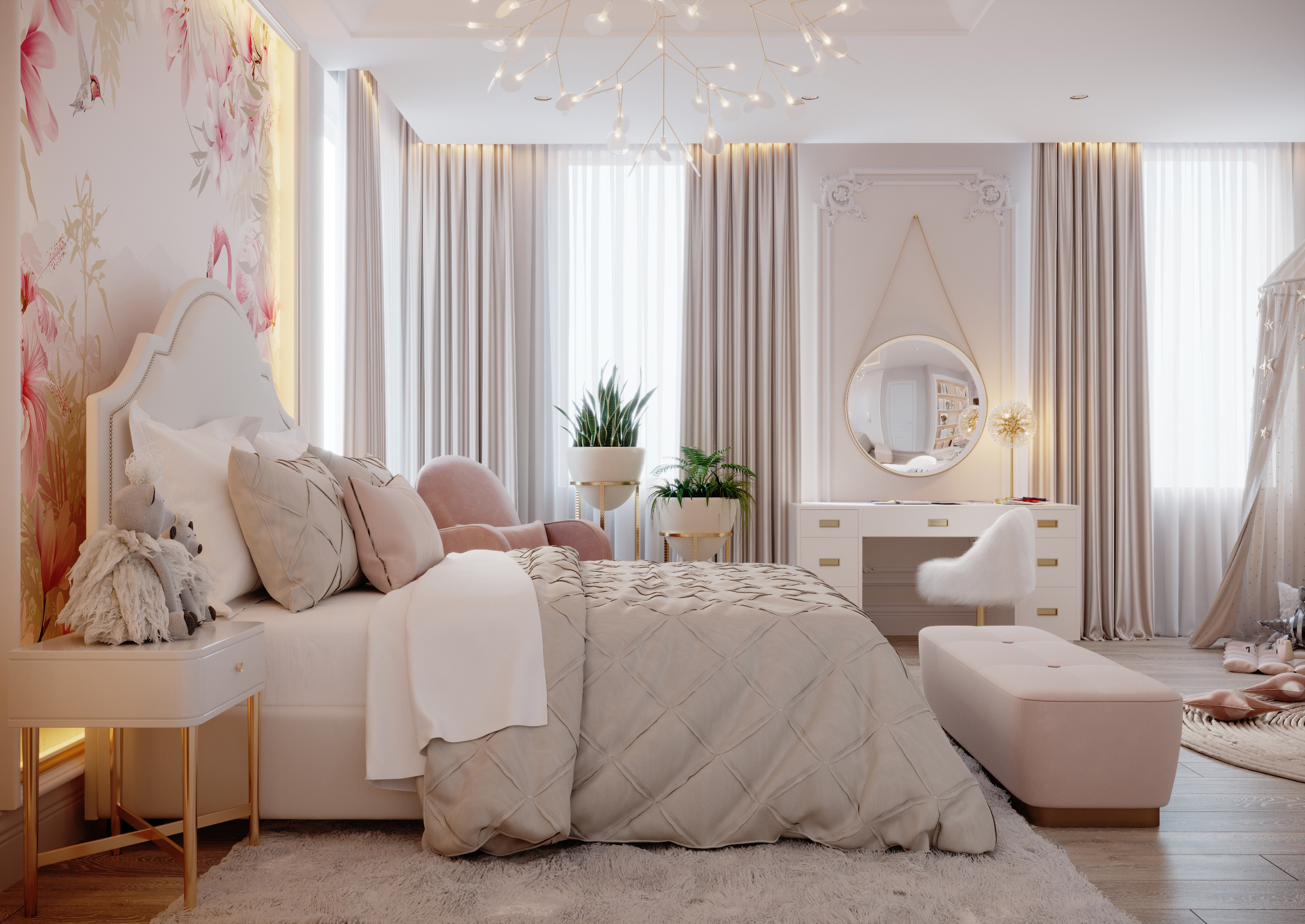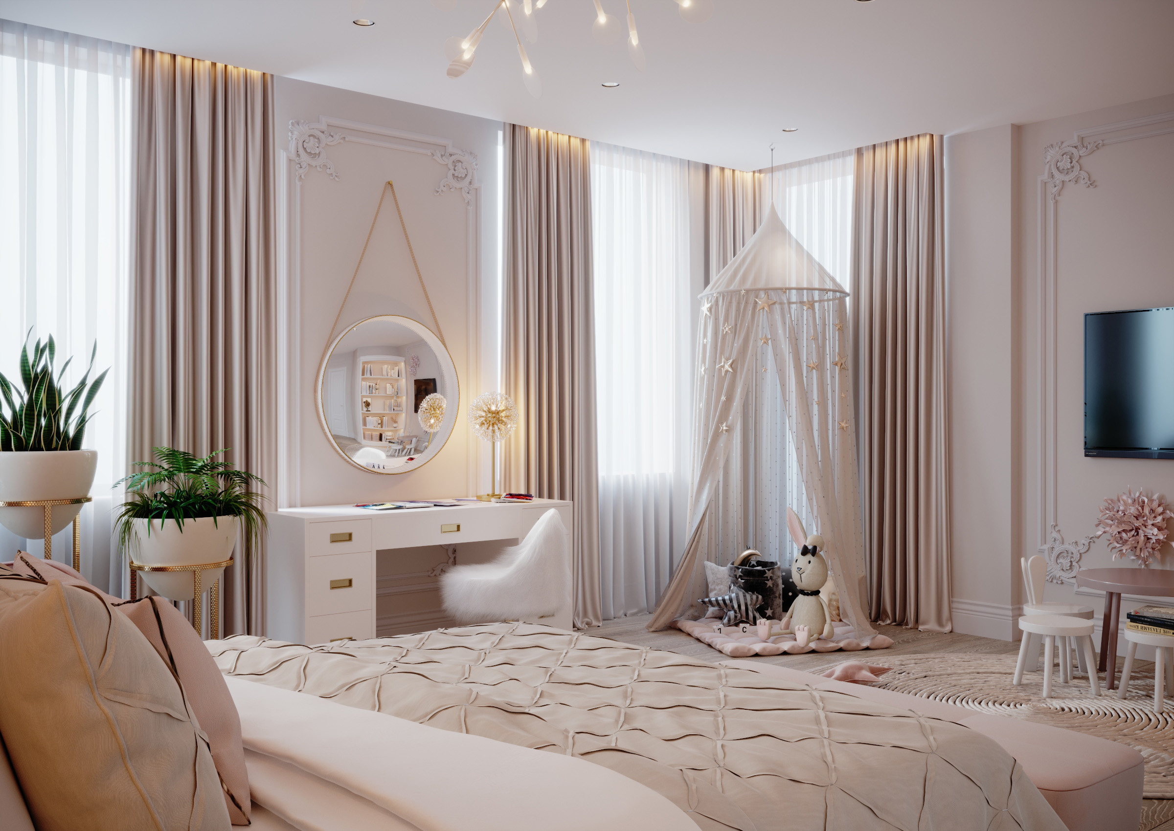 Notele calme continuă și în dormitoare. Și aici avem prezente accente aurii, iar lumina scoate în evidență jocul de texturi fine. Dacă în dormitorul matrimonial am optat pentru ancadramente mai subtile, în camera copilului am reluat firul jucăuș și clasic al formelor complexe. Diferențele sunt sesizabile și la nivel de planificare și zonare. Camera destinată stăpânilor a fost divizată în spațiu pentru somn, unde avem patul, noptierele și măsuța de toaletă, și zona de dressing. Camera copilului are o zonare mai complexă, spațiul urmând să îndeplinească mai multe funcții. Astfel, aici, pe lângă zona de dormit, a fost amenajată o bibliotecă, măsuța de toaletă, dar și un spațiu de joacă.