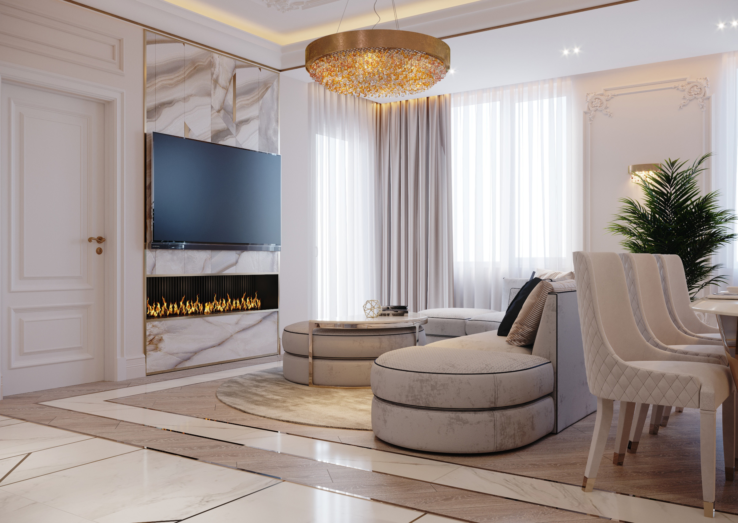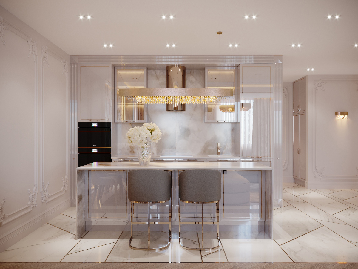 Am mizat pe un joc senzorial tandru, astfel în interior își fac loc aspectul rece al plăcilor ceramice, parchetul cald și textura fină a mobilei tapițate – toate în nuanțe neutre. Am dizolvat monotonia nuanțelor deschise prin accente aurii. Acestea se regăses, ca laitmotiv, în întreaga locuință, prezența lor fiind deosebit de sesizabilă în open space-ul care unește holul, livingul, bucătăria și sufrageria. Detașându-ne de ideile tradiționale, am renunțat la aranjarea clasică a plăcilor ceramice, creând atât pardoseala, cât și panourile din living din piese adunate ca un puzzle, unite între ele cu rosturi aurii. Gama coloristică și formele minimaliste ale mobilierului ne-au permis să introducem în acest spațiu ancadramente complexe pe pereți și corpuri de iluminat masive aurii, combinate cu cristale, ca accente de lux.