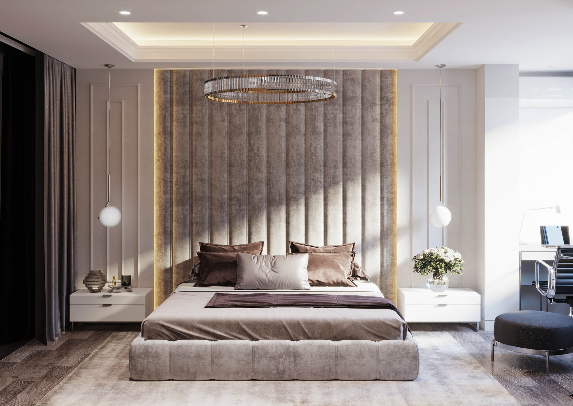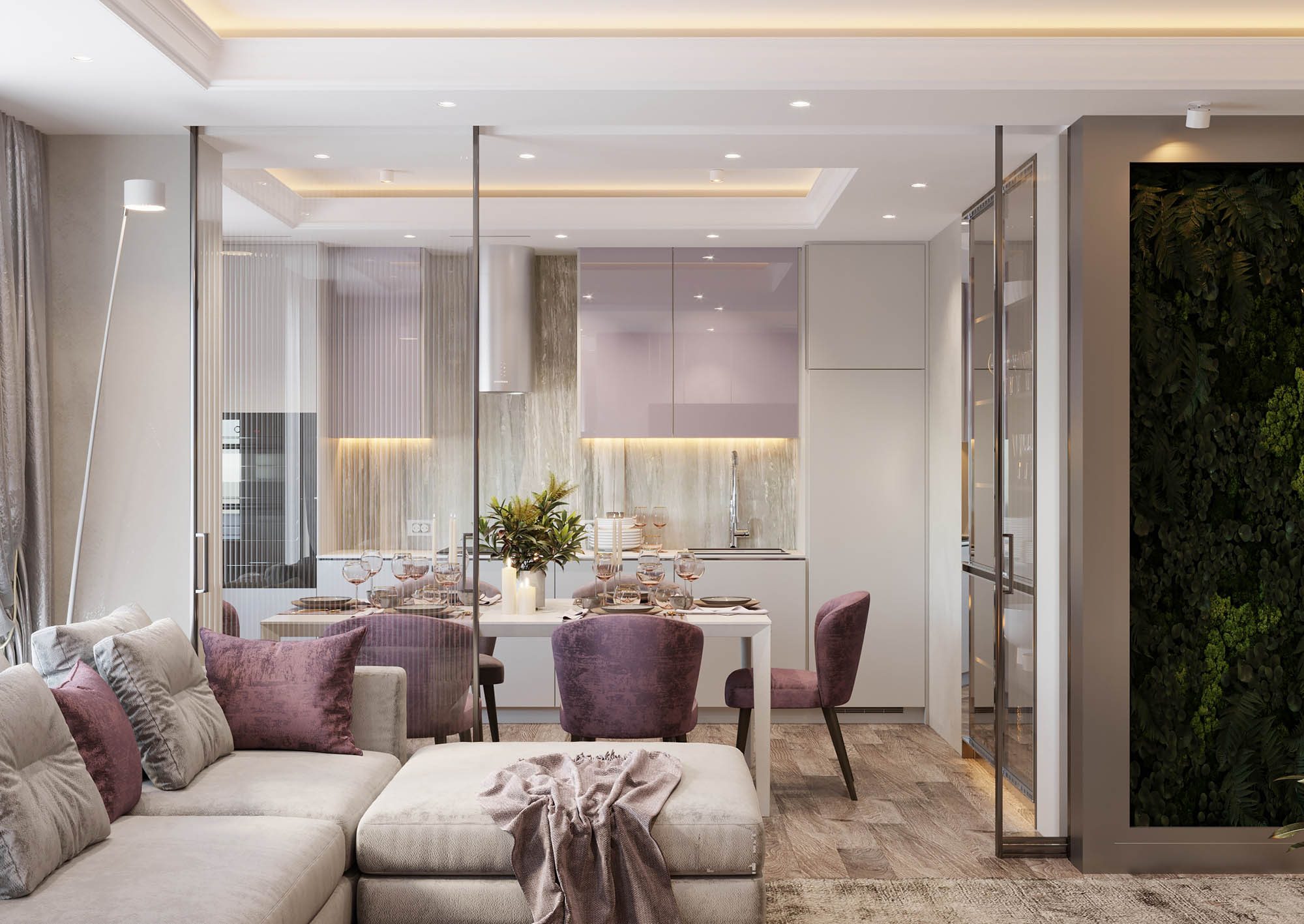 Дизайн всей квартиры создан на основе одних и тех же стилистических элементов, что делает его концепцию целостной. Мягкий текстиль придает пространству комфорт, зеркала создают ощущение простора, растения, интегрированные в проект, придают естественности, а тонкие рамки — это детали, которые определяют историю элегантного интерьера.