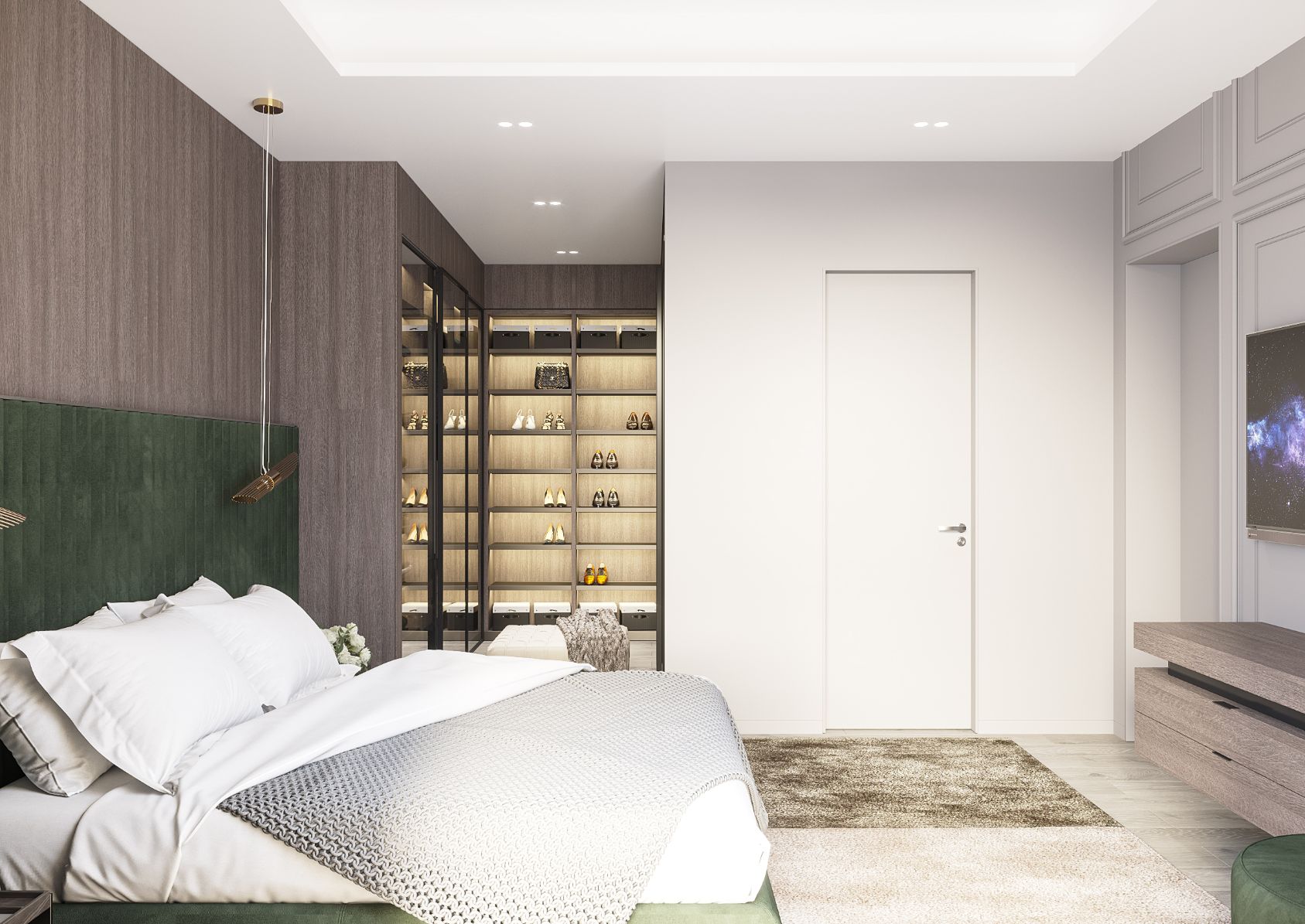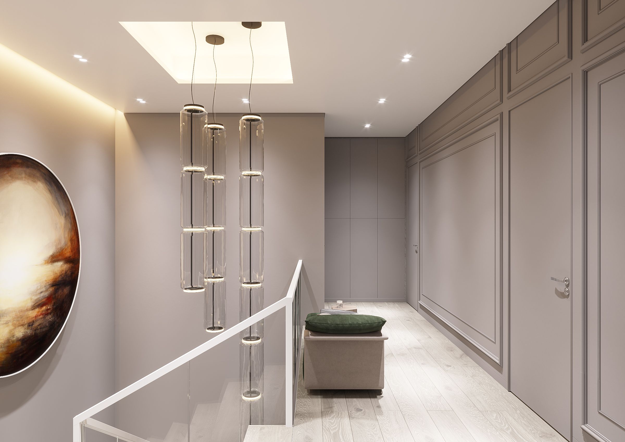 И на втором этаже оформление отличается простыми линиями и спокойными оттенками. Двери с незаметными коробками, лаконичные рамы, которые точно следуют архитектурным линиям, и композиционный баланс создает идеальную атмосферу для отдыха.