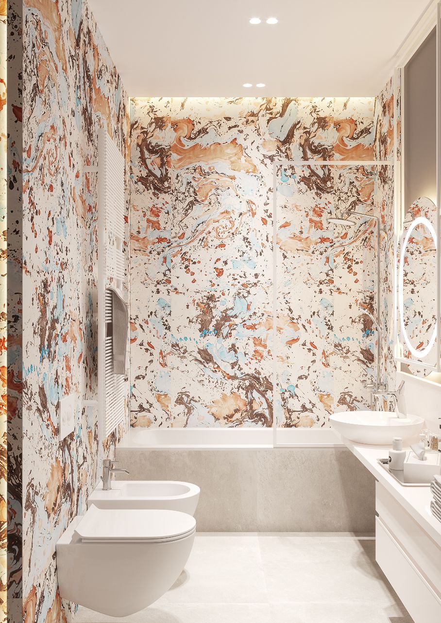 На самом деле, уединенность по-прежнему была одной из наших целей, и это очень хорошо выражено наверху. Там мы обустроили супружескую спальню с собственной ванной комнатой и две детские спальни. Хотя у них общая ванная комната, проект был построен таким образом, чтобы из каждой комнаты был доступ к этому помещению. Ванные комнаты, с другой стороны, заслуживают особого внимания, впечатляя уникальной керамической плиткой, которую мы представили в проекте. Мы говорим, что они уникальны, потому что они индивидуальны, их декор сделан художниками специально для этой цели.