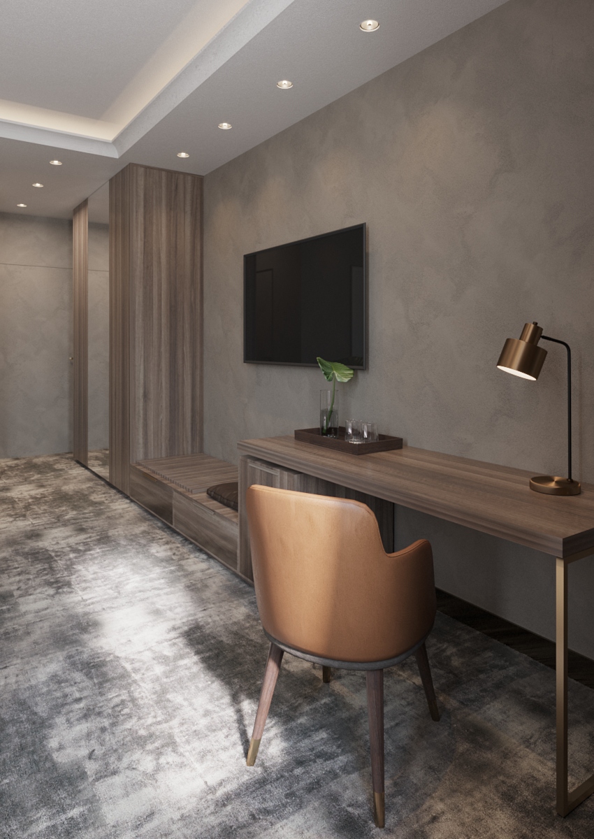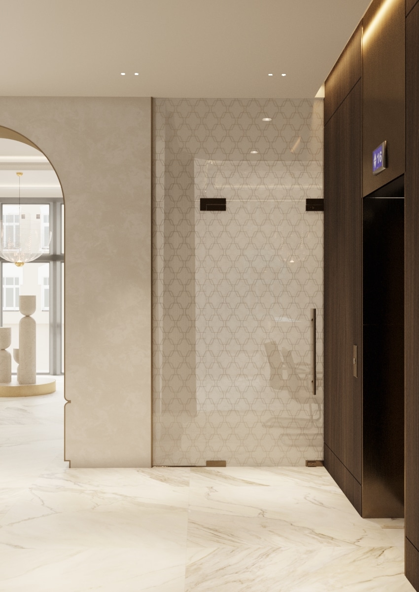В то же время мы хотели придать пространству естественность, поэтому остановили свой выбор на фанерной обшивке Walnut Lincoln. В зоне расположения арок мы положили травертин для придания ощущения освещенности и воздушности. Художественные и природные мотивы также присутствуют в номерах отеля — непреложный компонент, необходимый для объединения всех пространств в единую стилистическую концепцию.