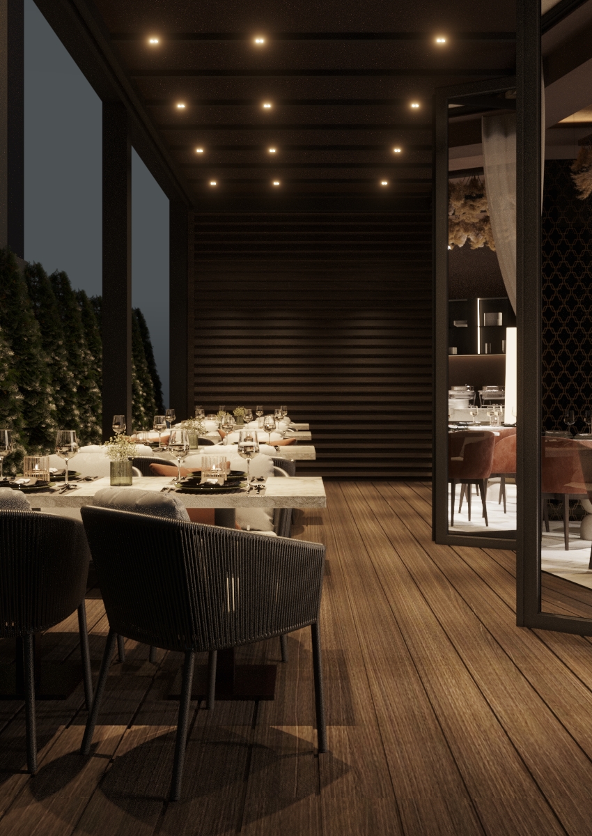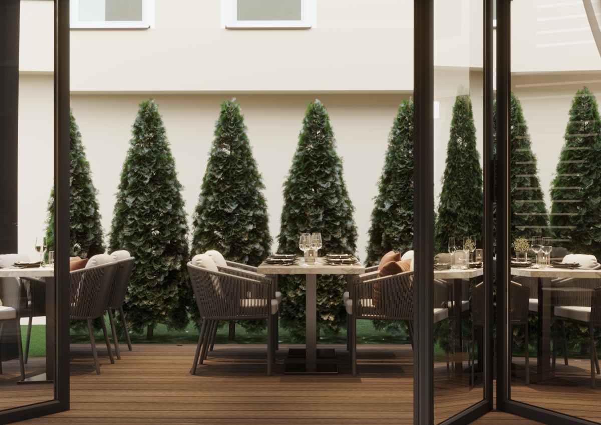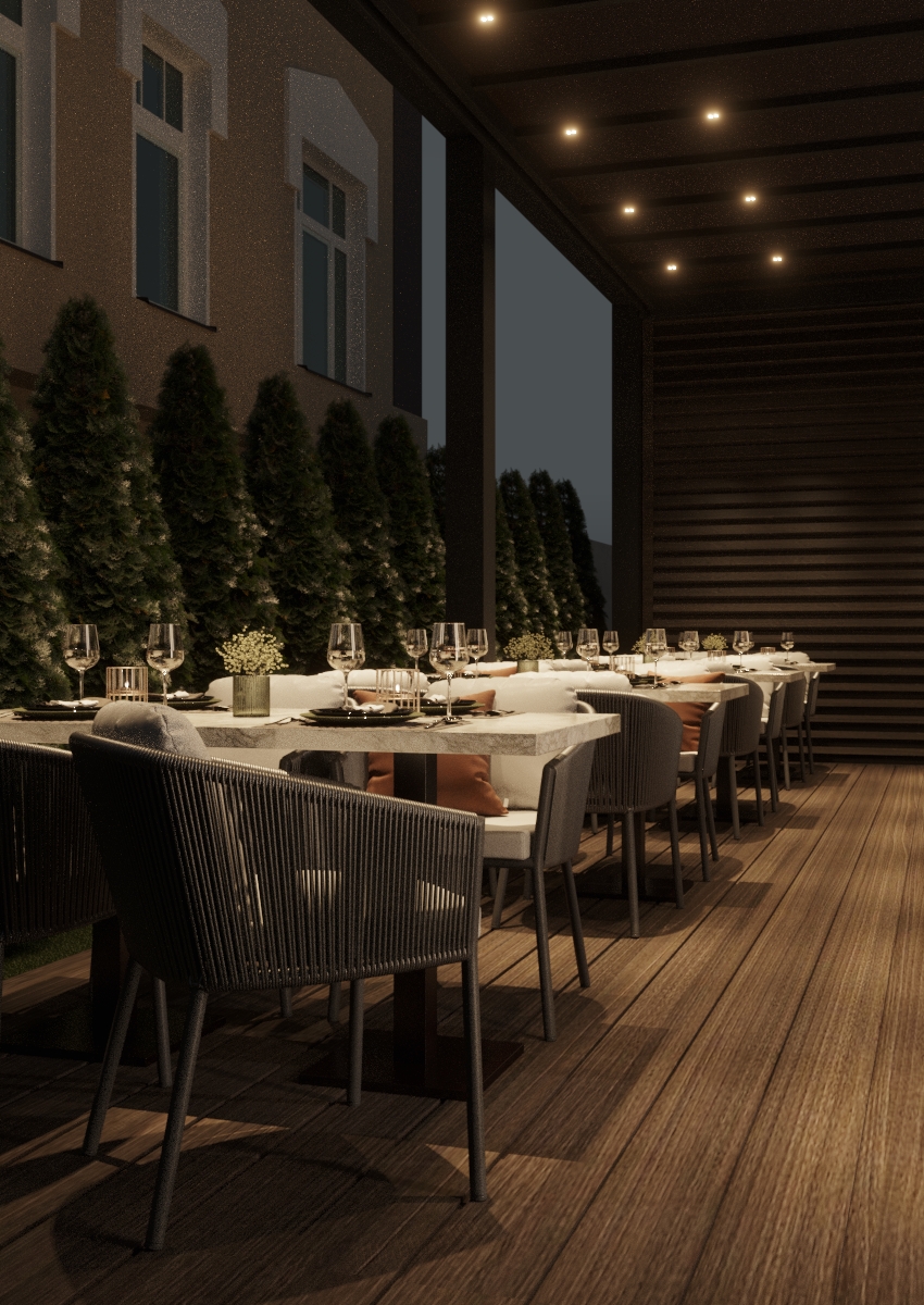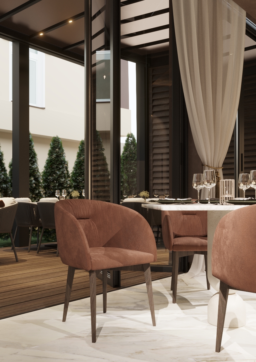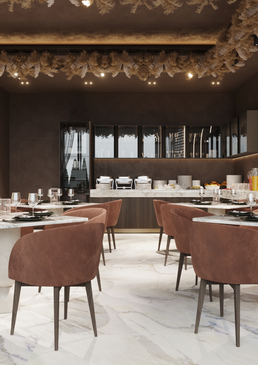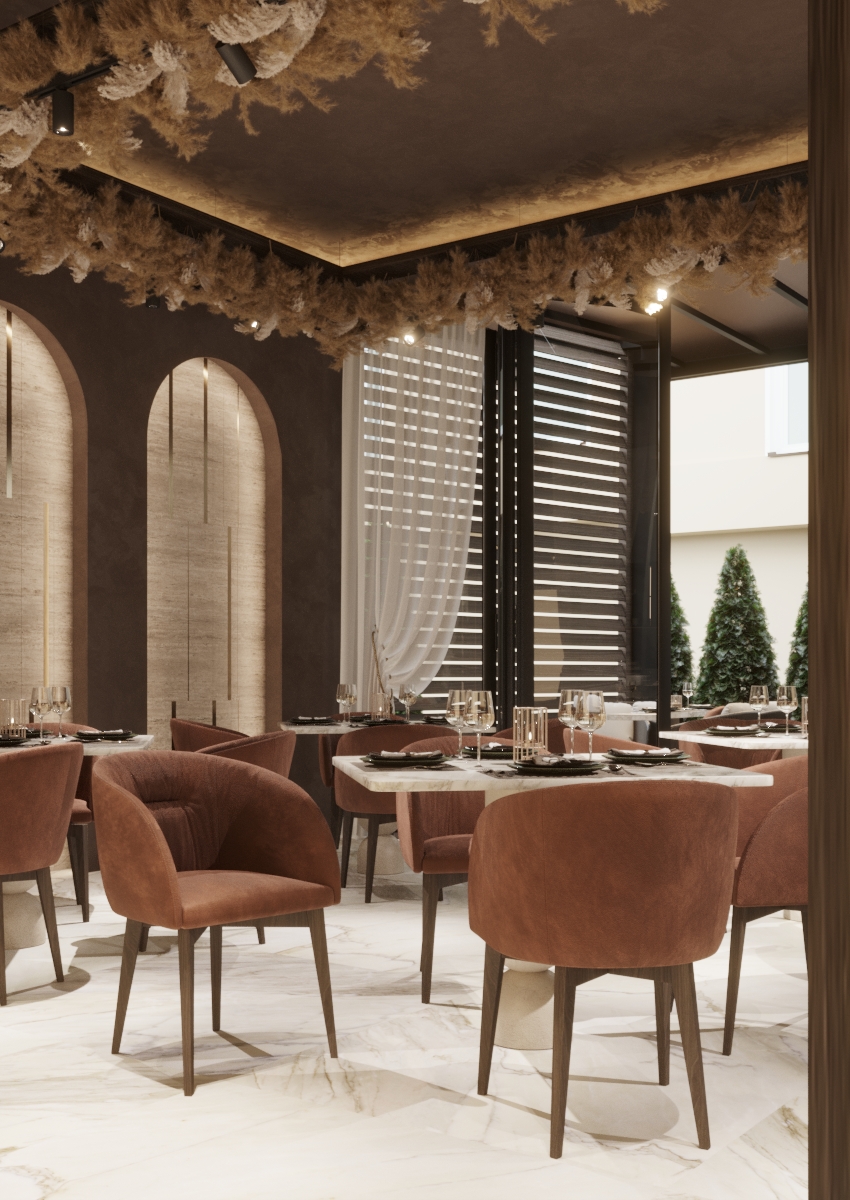 Тематика произведения Брынкуш продолжается и в ресторане, где пластичные линии ножек столов намекают на знаменитую скульптуру «Стол молчания». Каменная столешница придает пространству атмосферу долговечности, а круглые формы и стулья с мягкой обивкой контрастируют с ней и дополняют пространство комфортом. Атмосфера становится еще непринужденнее, когда окна полностью открыты и ресторан сливается с террасой.