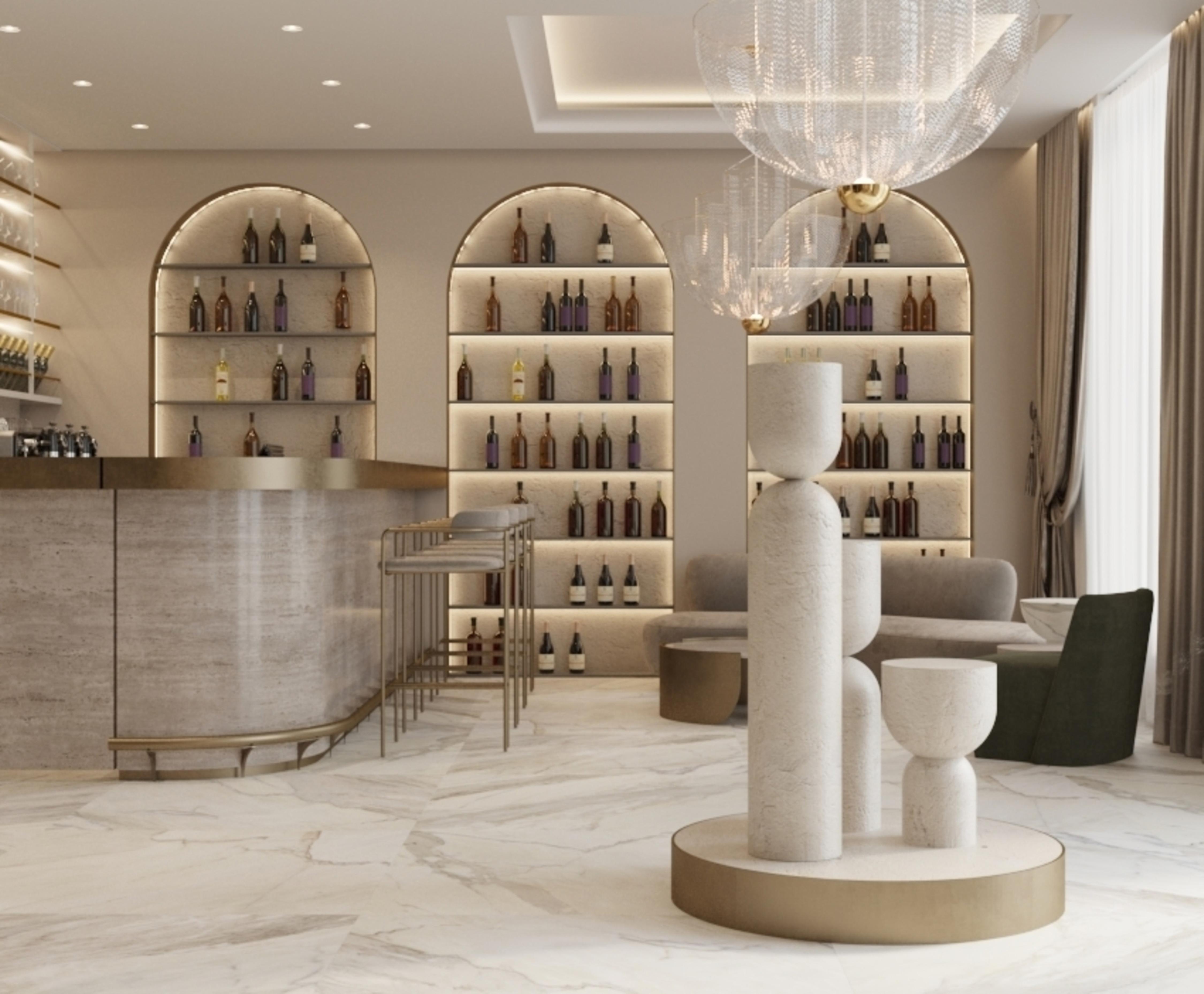 Тон всего пространства задается именно в зоне приема посетителей, где мы спроектировали стилизованную скульптуру по мотивам знаменитой «Колонны бесконечности». В тандеме с ней в этой же зоне размещена массивная люстра. Еще одним элементом аутентичности стала винотека в вестибюле, призванная подчеркнуть винодельческий профиль страны.